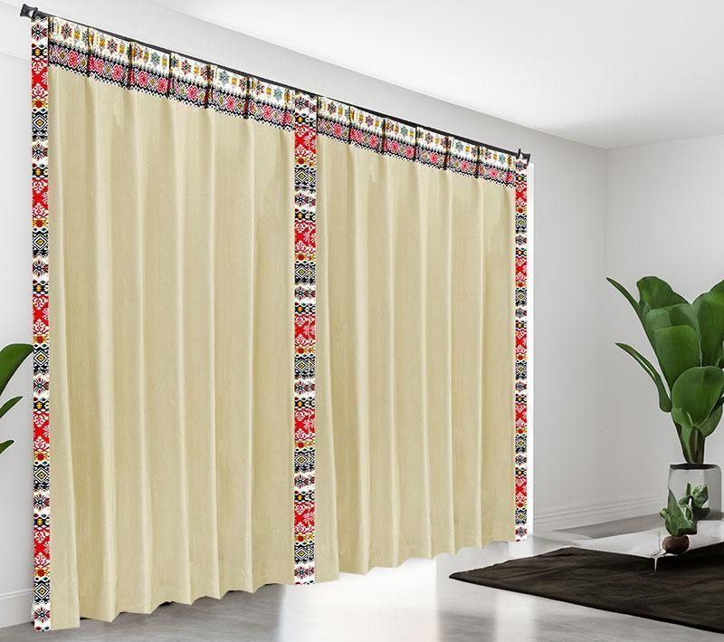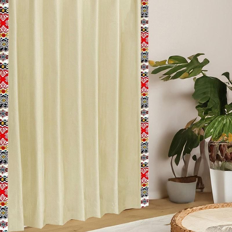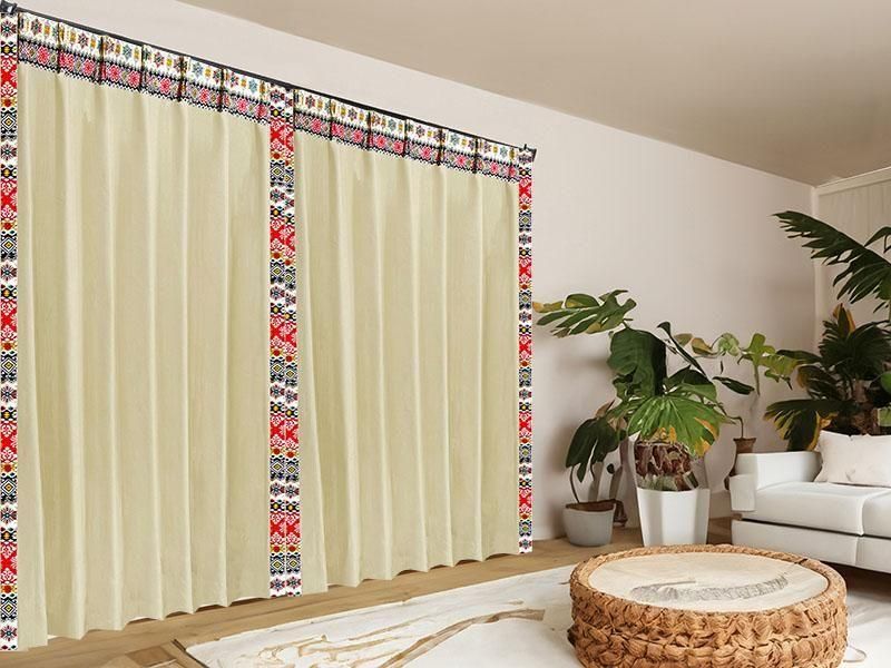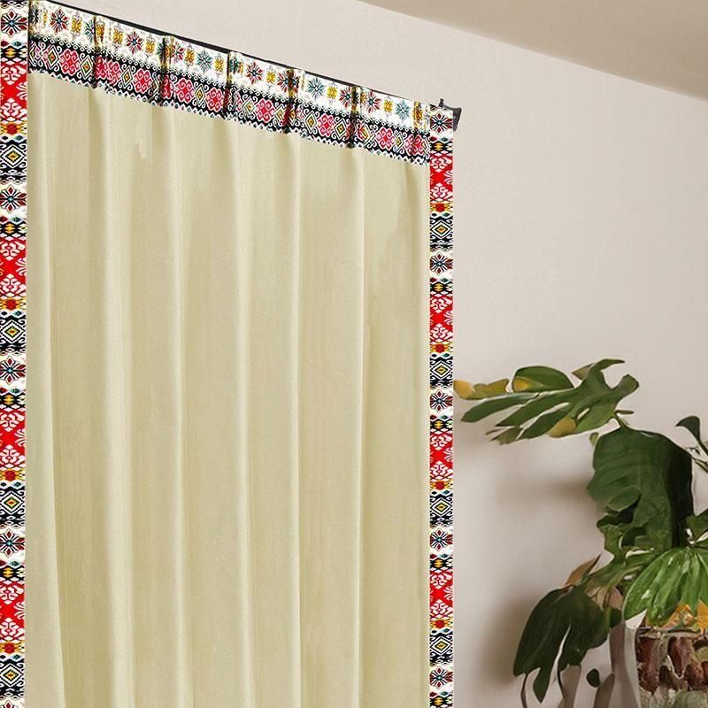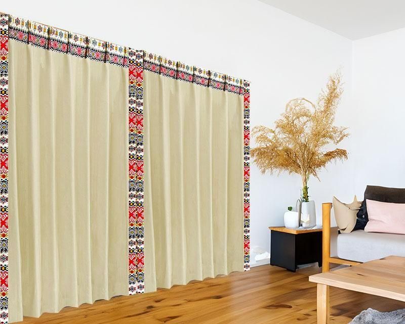 バリ島から直輸入した二ティックと言う良縁を招くとされる吉兆文様で星柄を描いた紅白のプラダバティック布でフェミニンな防炎クリーム色無地ドレープを彩った一人暮らしの大人の女性の部屋のプライバシーを守るアジアン・バリ専門店テレマカシイ《プライベートブランド》の、おしゃれな大人女子カーテン遮光1級《マーブルTアナ》を通販でお届け♪