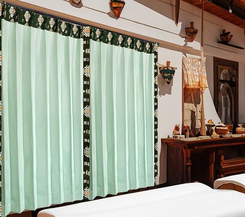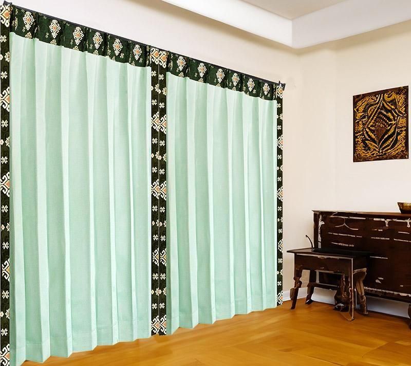 《REIGエクシードTプーケット》は、アイスグリーンの爽やかな色合いに、バリ島から直輸入した紋章模様プラダバティックをドレープの縁にフレーム状に施した高級リゾートカーテンです。紋章模様には「幸運を呼び寄せ、厄災を遠ざける」意味が込められており、ただのインテリアとしてではなく、暮らしに安心と豊かさをプラスしてくれます。上質な遮光1級・防炎・遮熱・防音機能を備えているため、ホテルやリゾート施設だけでなく、ご家庭のリビングや寝室にも最適です。シンプルでありながら存在感のあるデザインは、アジアンモダンなお部屋づくりにぴったり。カーテンレールにそのまま掛けて使える手軽さも魅力です。