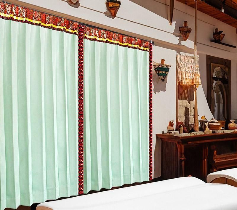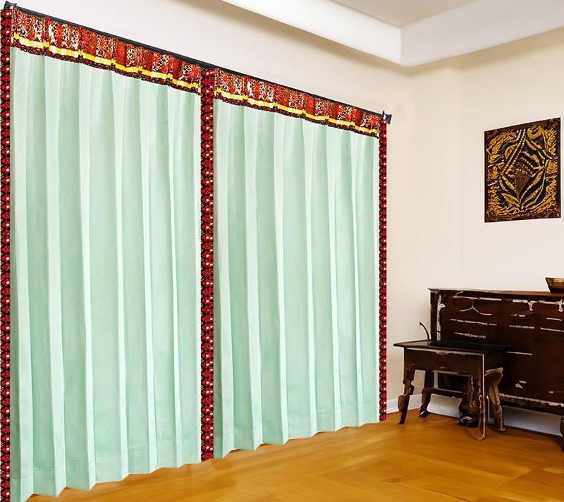 シーサイドリゾートカーテン 《エクシードTテルティナ》はバリ島から直輸入した幸運の芽生えや富貴を招くとされる菊花模様を描いたファッショナブルなプラダバティック布で清涼感と開放感をもたらすソフトな手触りの高機能アイスグリーン色ドレープを彩った斬新なフレームデザインが個性派インテリアを演出する、おしゃれなマリン風リゾートカーテンです。