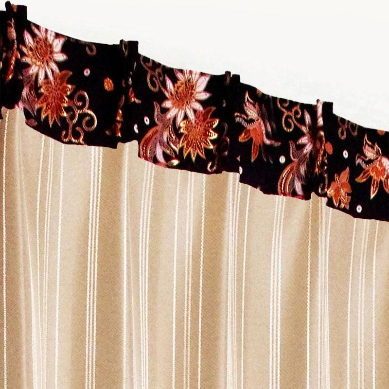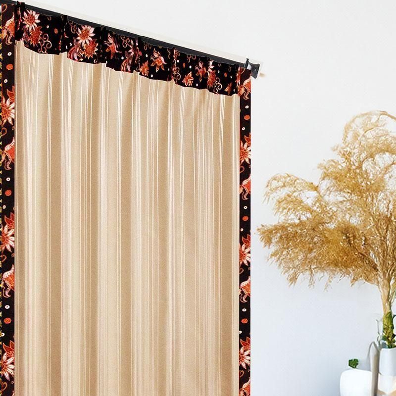 光沢糸で織り上げたベージュのピンストライプ生地に、バリ島直輸入の民族衣装プラダバティックから着想を得た赤いハイビスカス模様をデザインした、アジアンテイストの遮光2級カーテン。