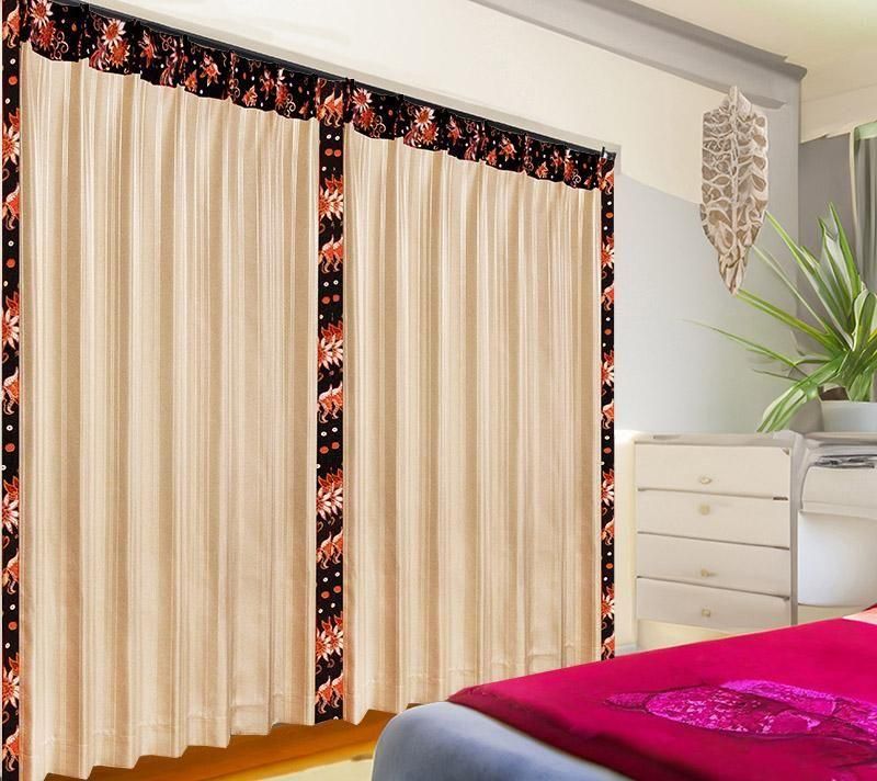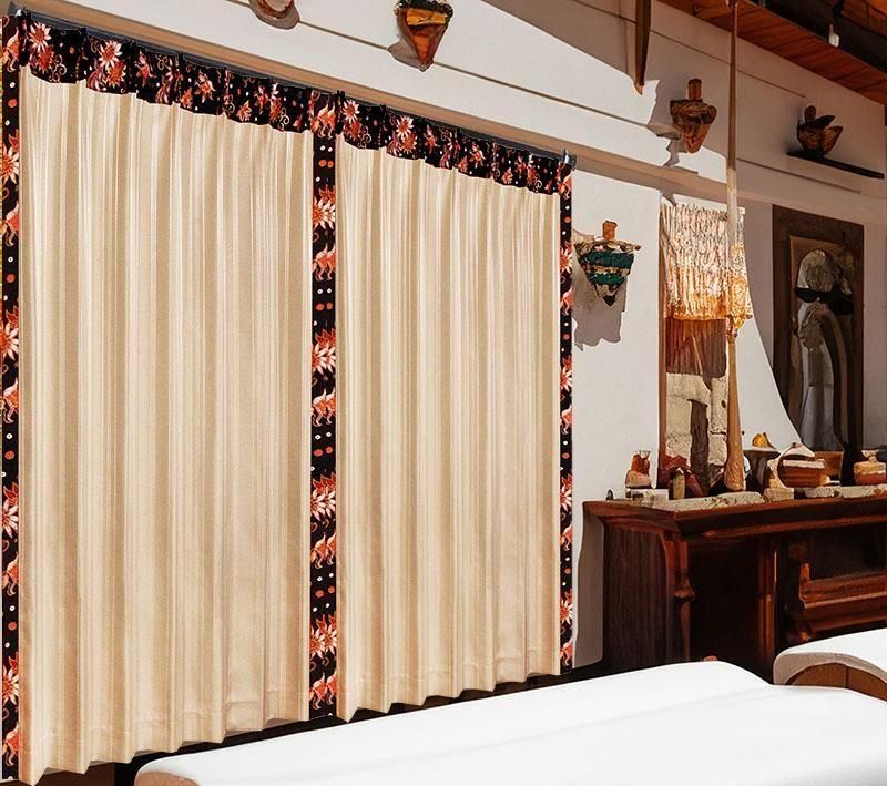 ベージュの光沢ピンストライプに、赤いハイビスカスをあしらった本カーテンは、アジアンリゾートの上質感と実用性を兼ね備えています。