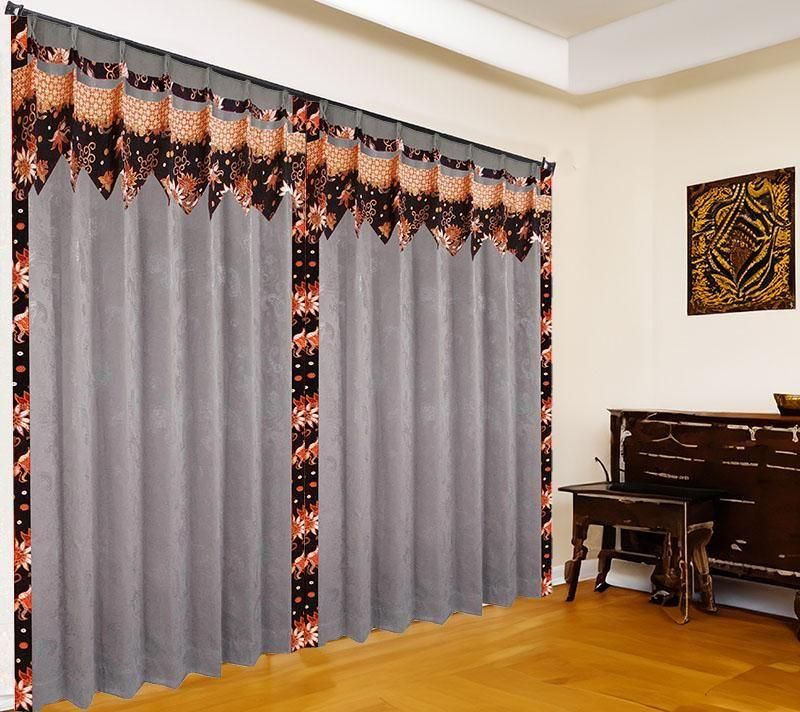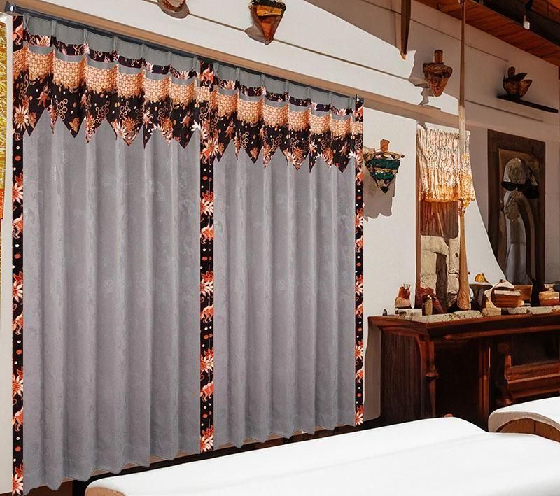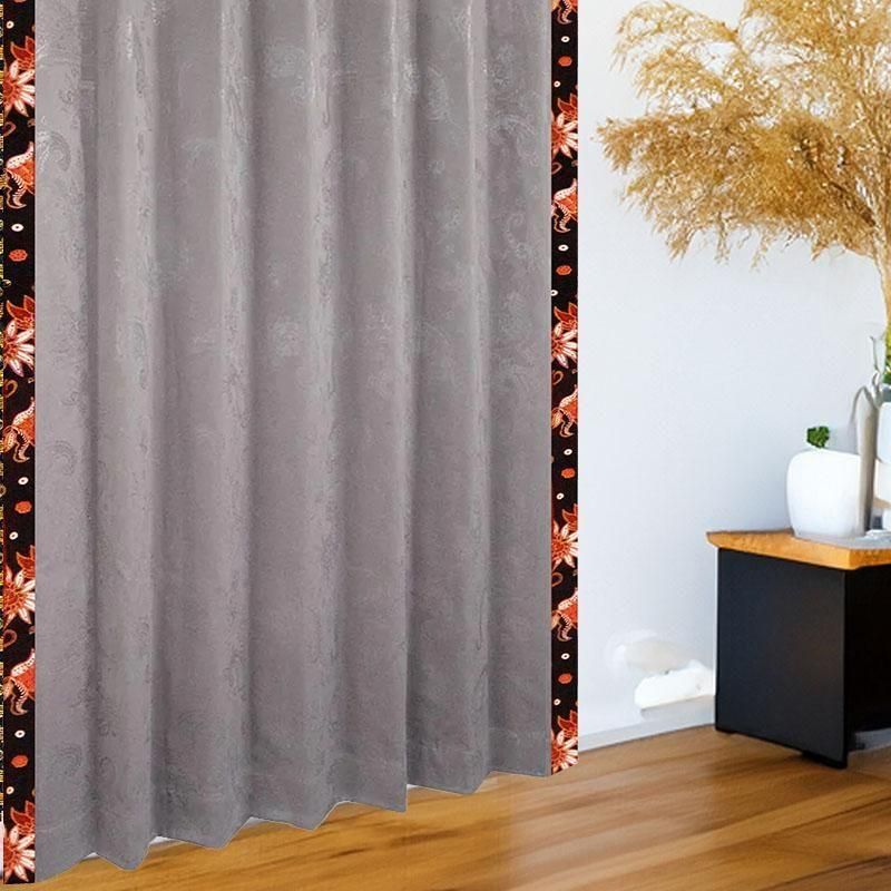 グレーを基調にベージュの小桜柄フリルをあしらったエスニックカーテン。遮光1級・遮熱・防音・保温機能を備えたモダン&エキゾチックなオリジナルデザインで、上品で落ち着いた空間を演出します。