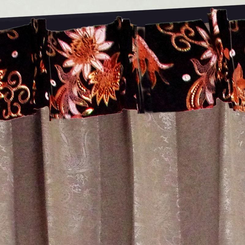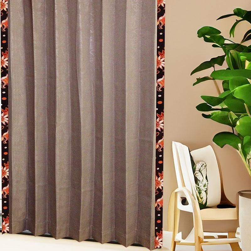 バリ島直輸入・赤色ハイビスカス模様のプラダバティック生地を飾りに使用。遮光2級で暮らしに馴染む男前インテリア向けカーテン。