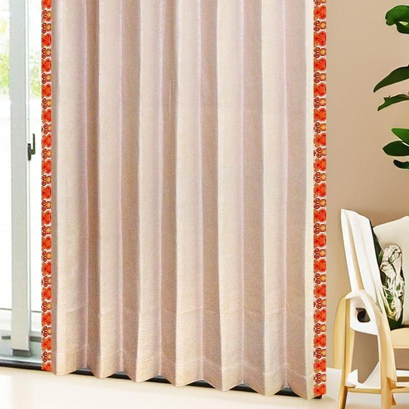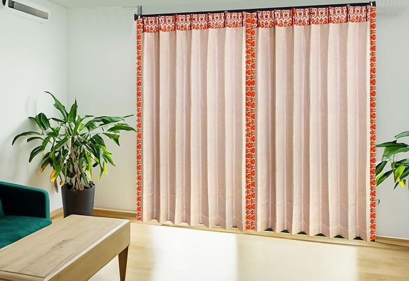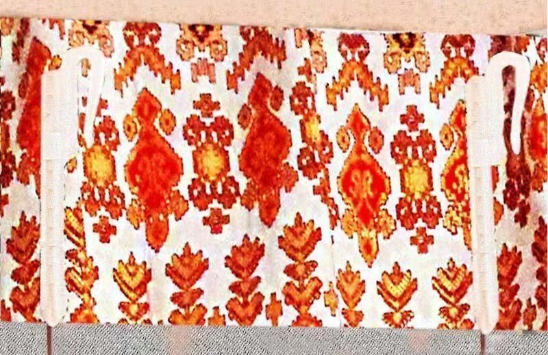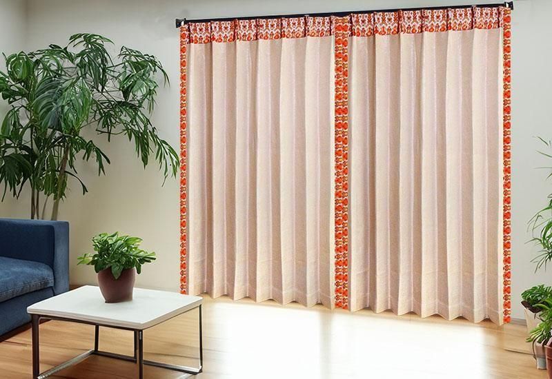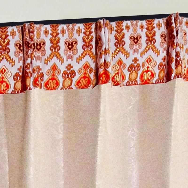 オレンジの宝尽くし模様が印象的なアジアン風メンズカーテン。バリ島直輸入の民族衣装プラダバティック布をベージュ色ドレープにフレーム状に飾り、穏やかで上質な空間を作り出します。遮光2級で快適な居住性を保ちながら、おしゃれで男らしい雰囲気を演出します。