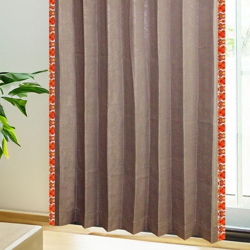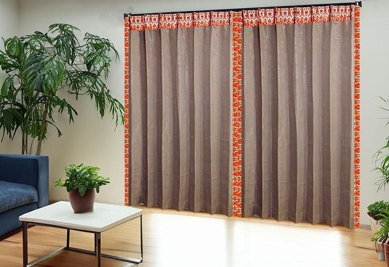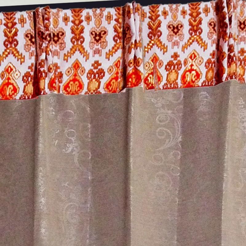 バリ島から直輸入した民族衣装プラダバティック布を使用。ブラウンのドレープにオレンジの宝尽くし模様をフレーム状に飾った、おしゃれなアジアン風メンズカーテンです。遮光2級の機能で快適さと美しさを両立し、男前インテリアに最適なデザインです。