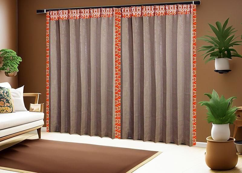 MEBRフランジパニTマフロ・ブラウン・オレンジの宝尽くし模様飾り・遮光2級は、バリ島の伝統と現代的デザインが融合した上質なメンズカーテン。おしゃれで落ち着きのある男の部屋を求める方にぴったりの逸品です。