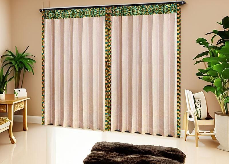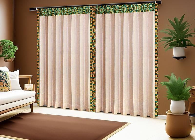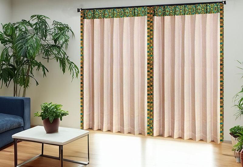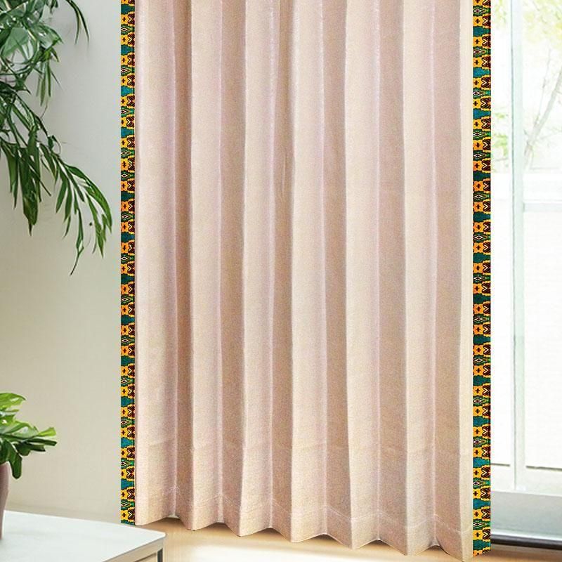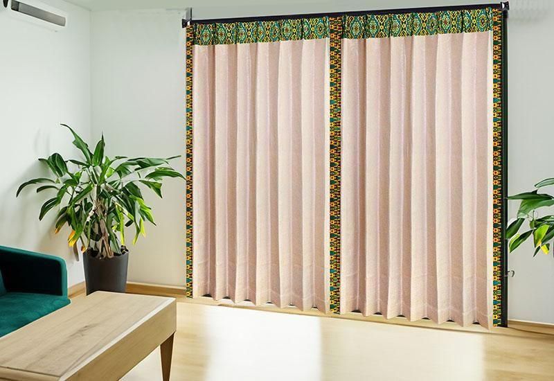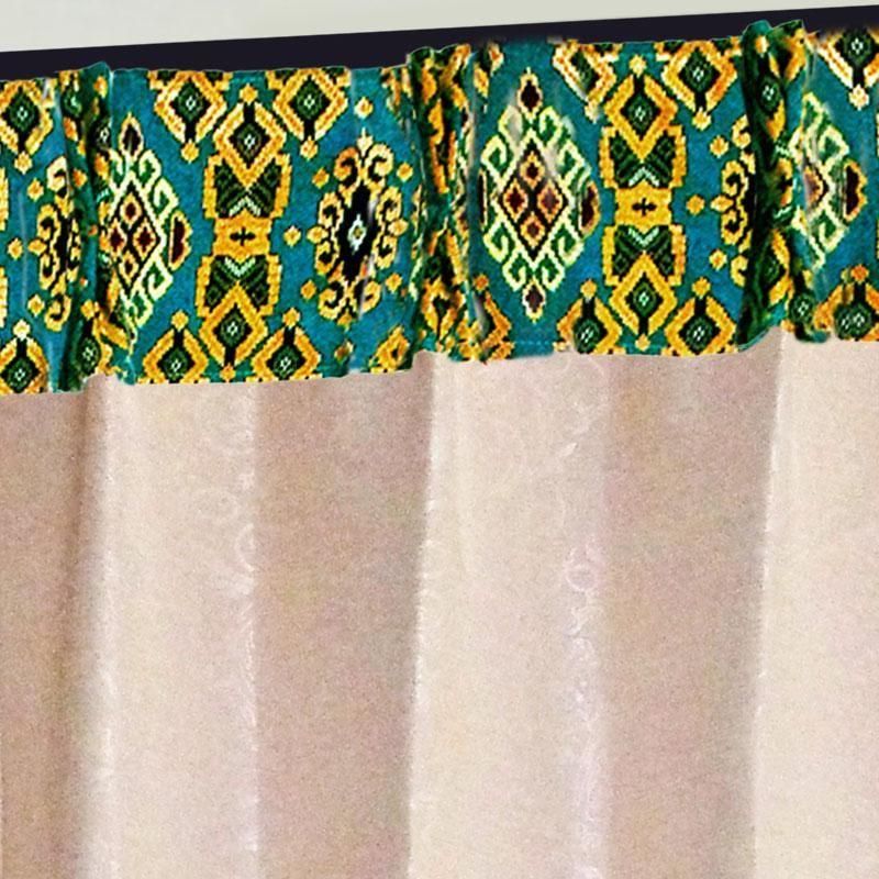 バリ島直輸入のプラダバティック布を使用した、おしゃれで上質なメンズカーテン。ターコイズブルーの曼陀羅模様をベージュのドレープにフレーム状に飾り、穏やかで洗練されたアジアンリゾートの空間を演出します。遮光2級の機能で快適な暮らしと癒しの雰囲気を両立します。