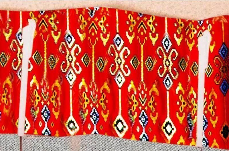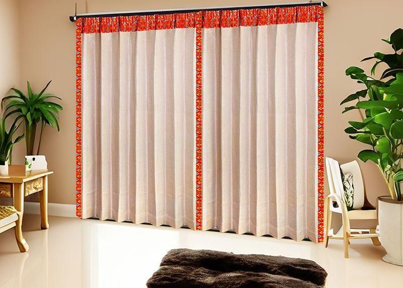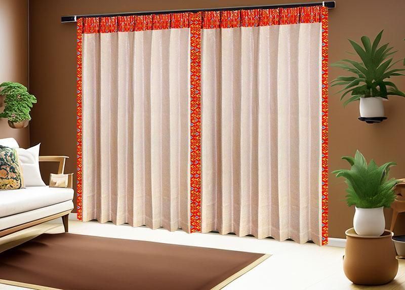 バリ島の伝統布「プラダバティック」を使用したオリジナルメンズカーテン。朱色の玉簾(たますだれ)模様をフレーム状に配したデザインが、ベージュのドレープに華やかさと落ち着きを添え、上質でおしゃれなアジアン空間を演出します。