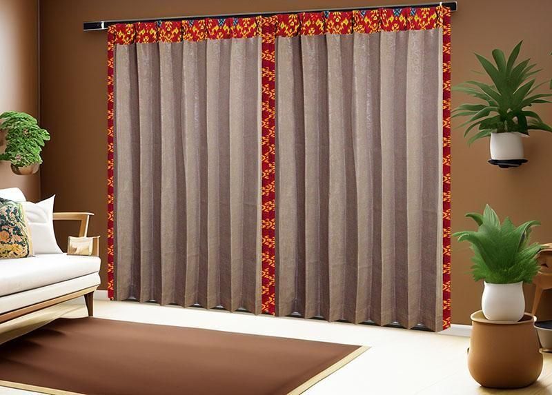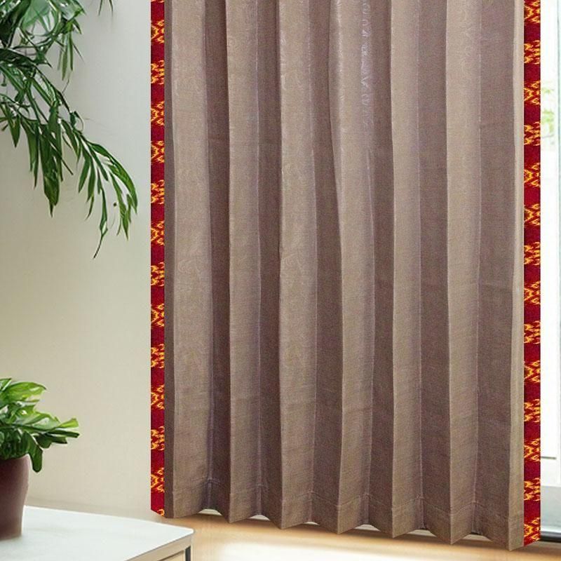 バリ島から直輸入したプラダバティック布を使用したオリジナルメンズカーテン。深みのあるブラウンのドレープに、オレンジの生命の樹模様をフレーム状に飾り、アジアンモダンな高級感を演出します。遮光2級の実用性と上質なデザインが融合し、大人の男の部屋にぴったりのカーテンです。