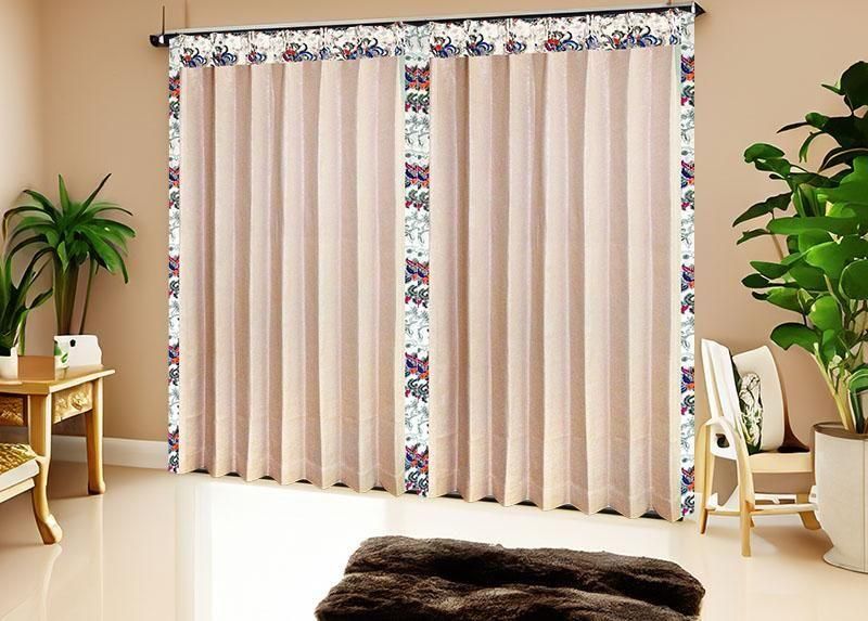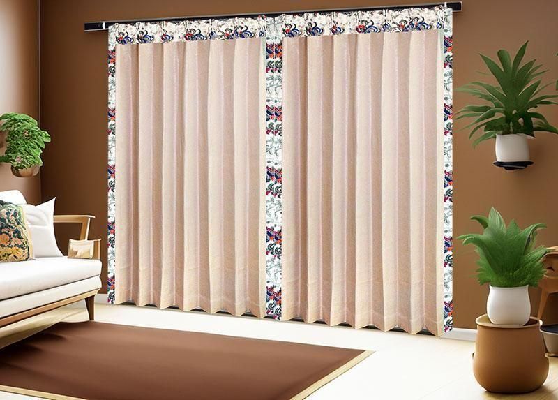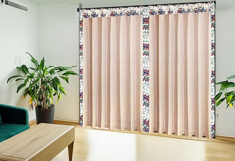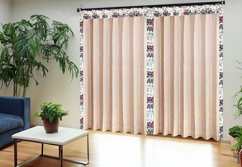 おしゃれなメンズカーテン|MEBEフランジパニTガルーダ・ベージュ・カラフルなハイビスカス模様飾り・遮光2級