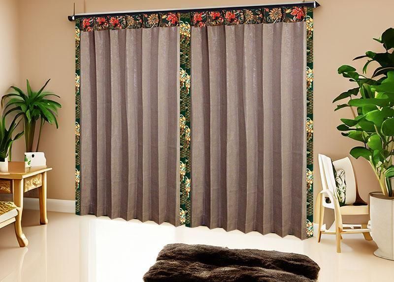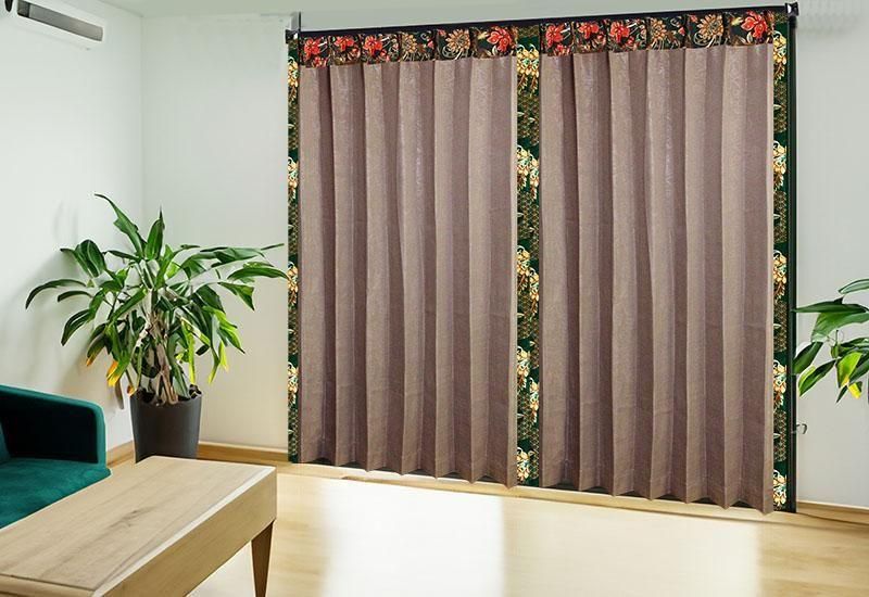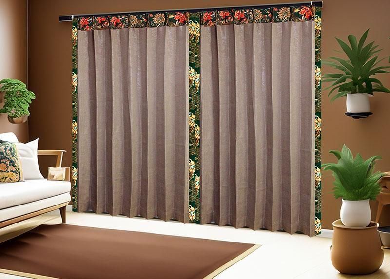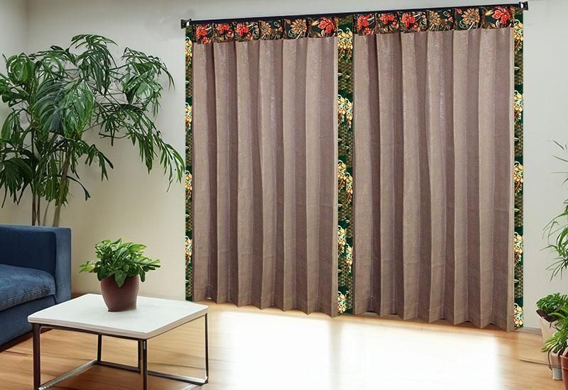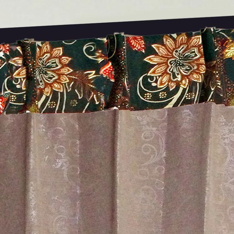 ブラウンのドレープに赤いプルメリア模様をあしらった、おしゃれで上質なメンズカーテン。バリ島直輸入のプラダバティック布を使用し、南国の華やかさと落ち着いた重厚感を融合。遮光2級で快適な空間を作る、アジアンモダンなオリジナルデザインです。