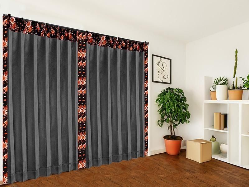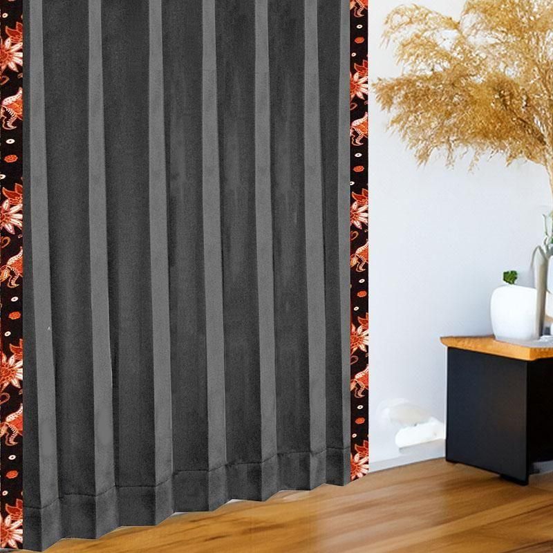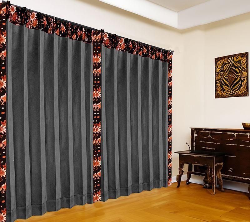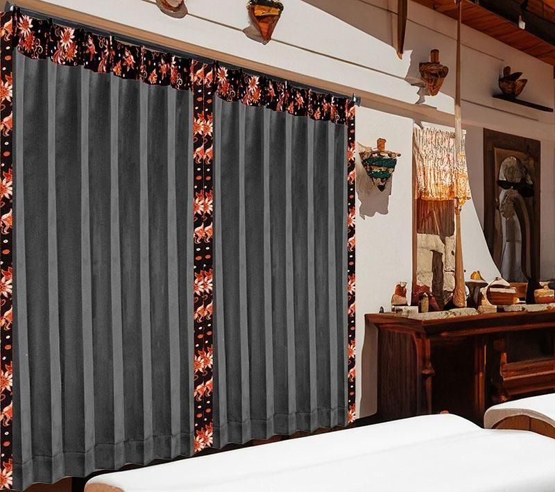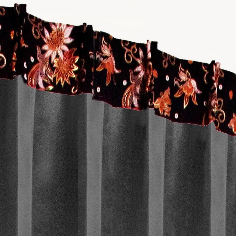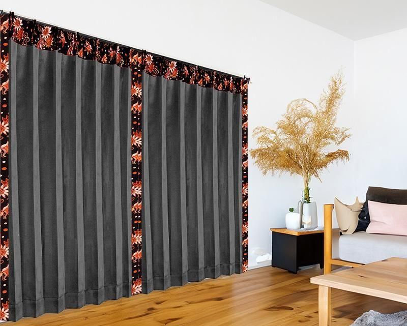 深みのあるブラック無地のドレープに、バリ島から直輸入した赤色ハイビスカス模様プラダバティック布をフレーム状に飾った、アジアンテイストのオリジナルリゾートカーテン。