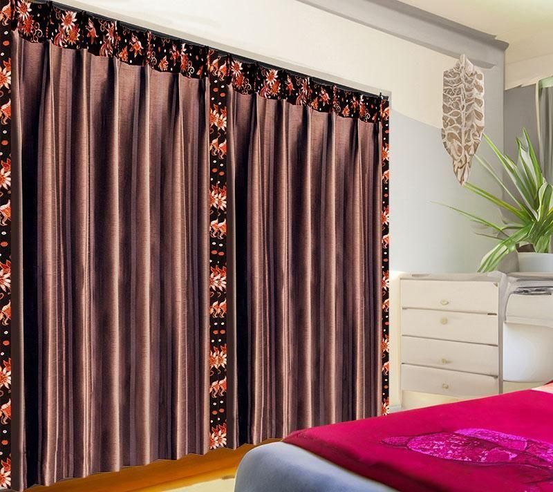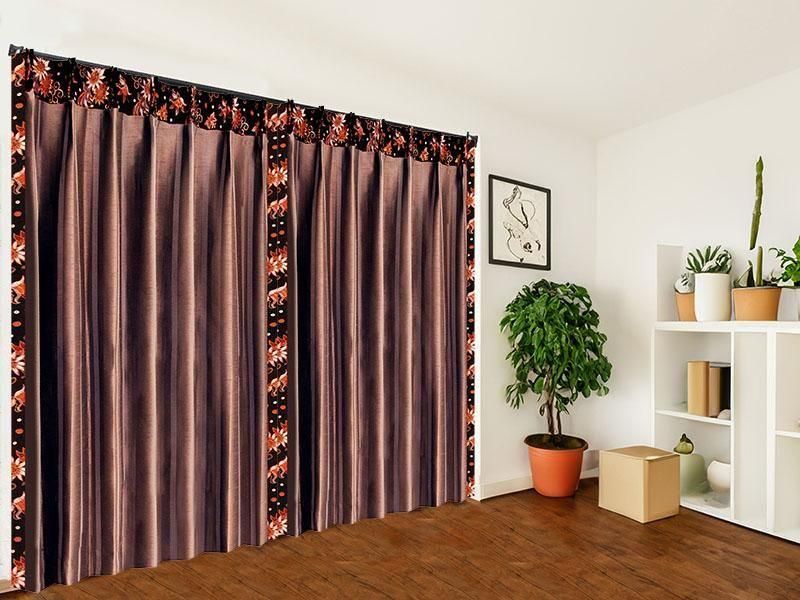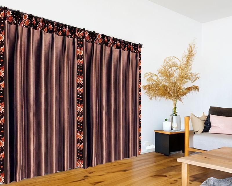 「MEBEラインTプリンセス」は、赤色ハイビスカス模様の華やかさとブラウンの重厚感が融合した遮光1級カーテン。