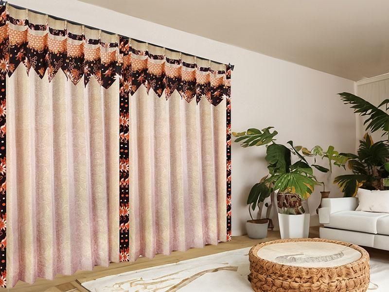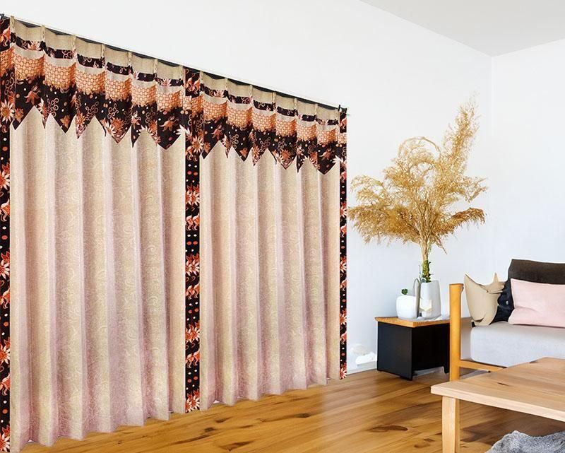 バリ島から直輸入したベージュの麻の葉模様プラダバティック布を、ベージュのプルメリア柄ドレープの上部にフリルとしてあしらったアジアンカーテン。