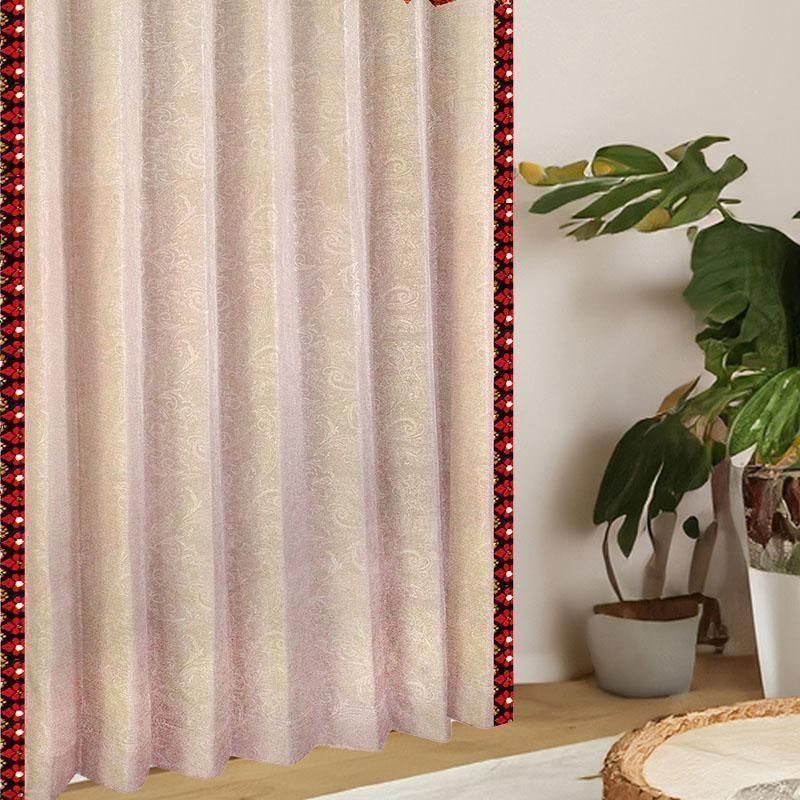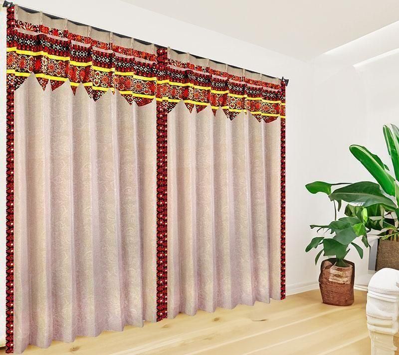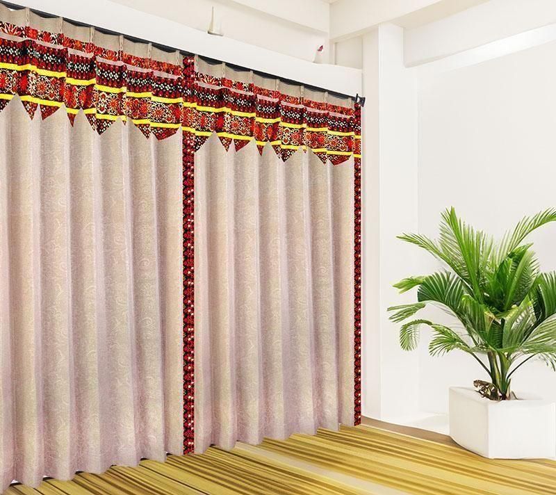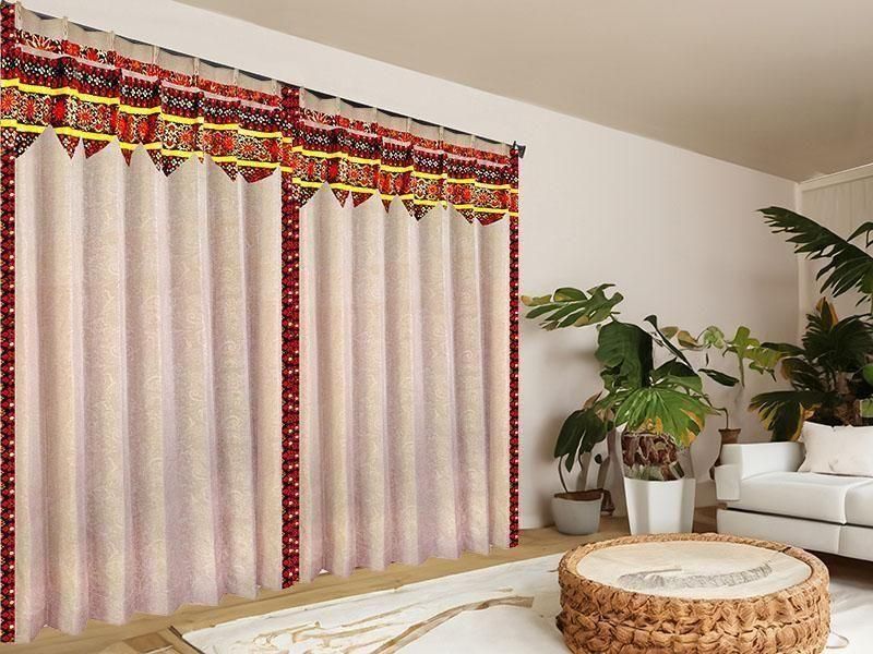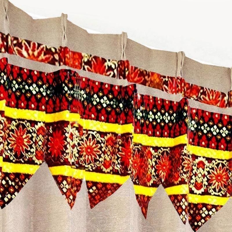 バリ島直輸入の朱色の菊花模様プラダバティック布フリルを、ベージュのプルメリア柄ドレープの上部にあしらったオリジナルデザイン。