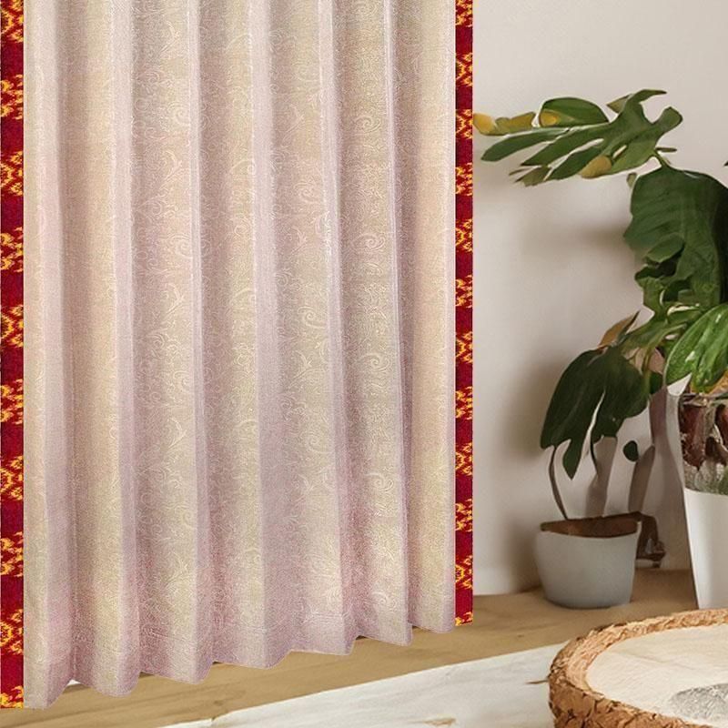 ベージュのプルメリア柄ドレープ上部に配置した、存在感のあるオリジナルデザイン。