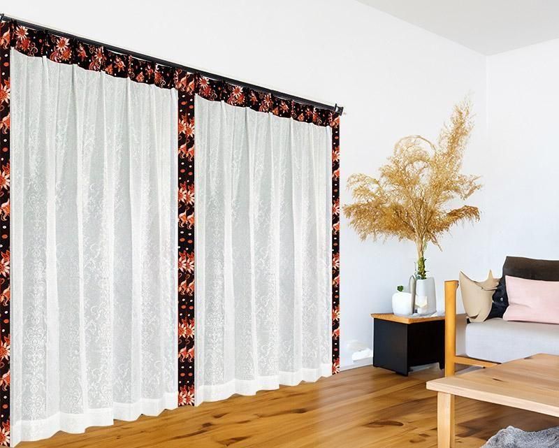 白レースの繊細な透け感が自然光を柔らかく採り入れ、赤いハイビスカス柄がアクセントとなって室内を華やかに演出。