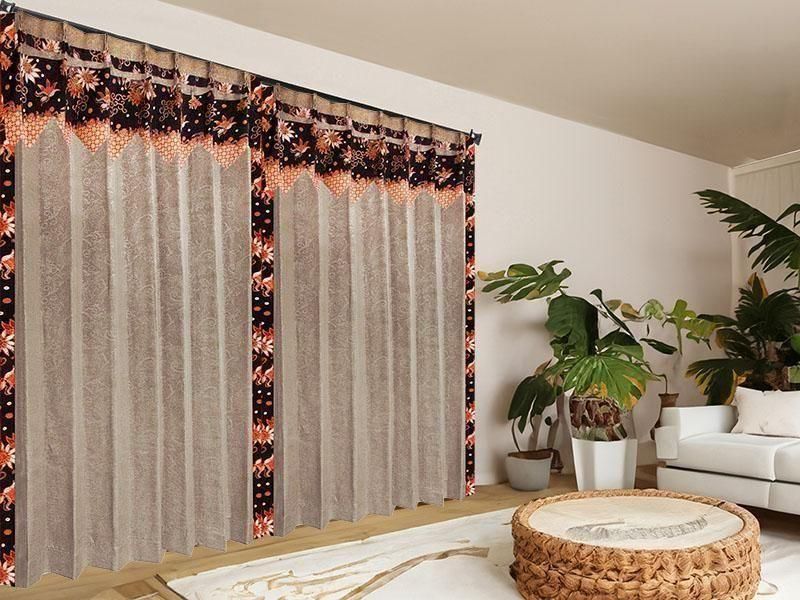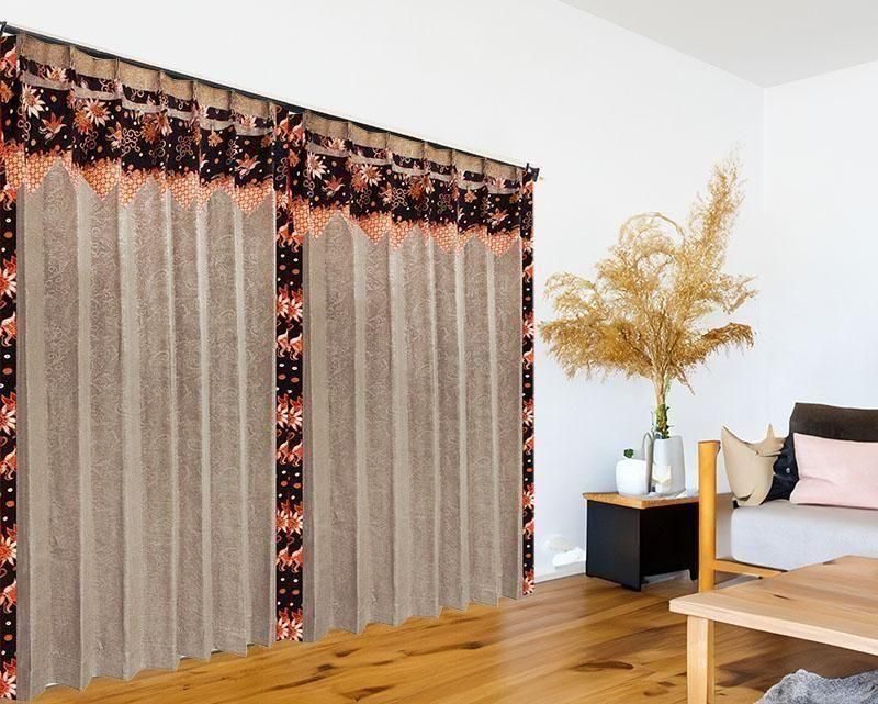 遮光2級の機能を持つブラウン色のプルメリア柄ドレープの上部に、