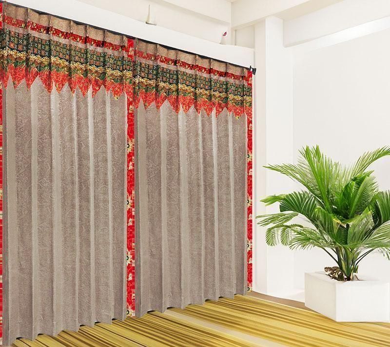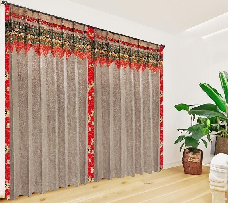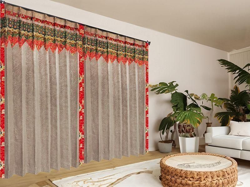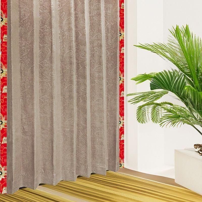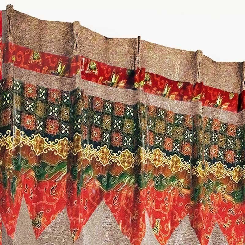 遮光2級のブラウン色プルメリア柄ドレープ上部に、バリ島直輸入の小桜模様プラダバティック布フリルをあしらった、落ち着きと上品さを兼ね備えたオリジナルデザインです。