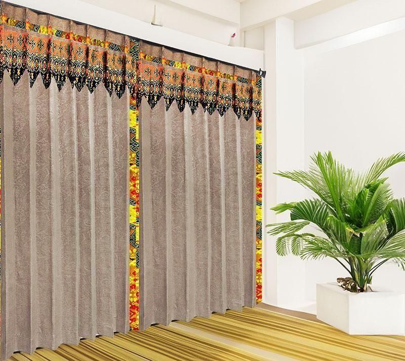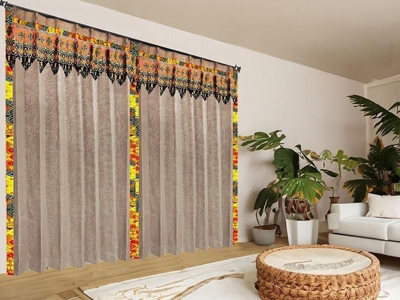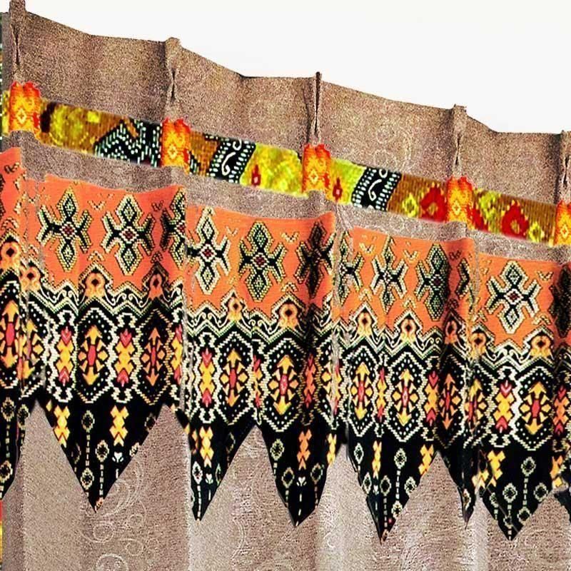 ブラウン色プルメリア柄ドレープ上部に、バリ島直輸入のカフェオレ色の七宝根模様プラダバティック布フリルをあしらったモダンなオリジナルデザインです。