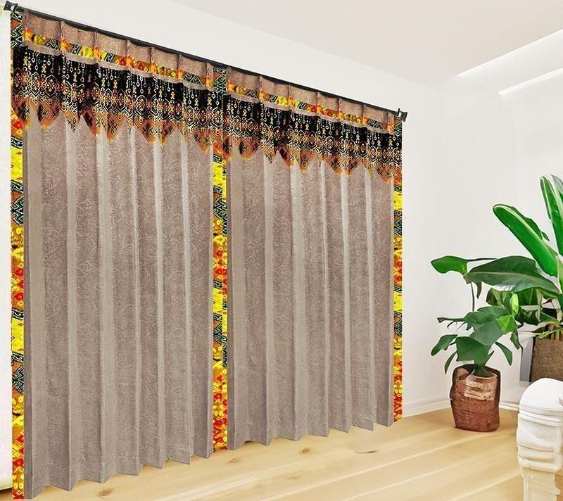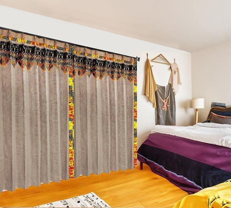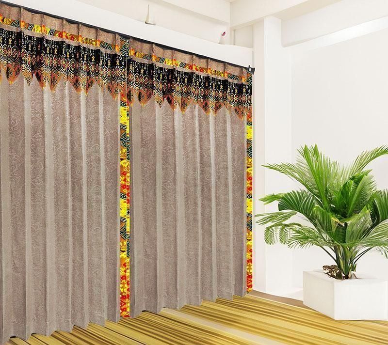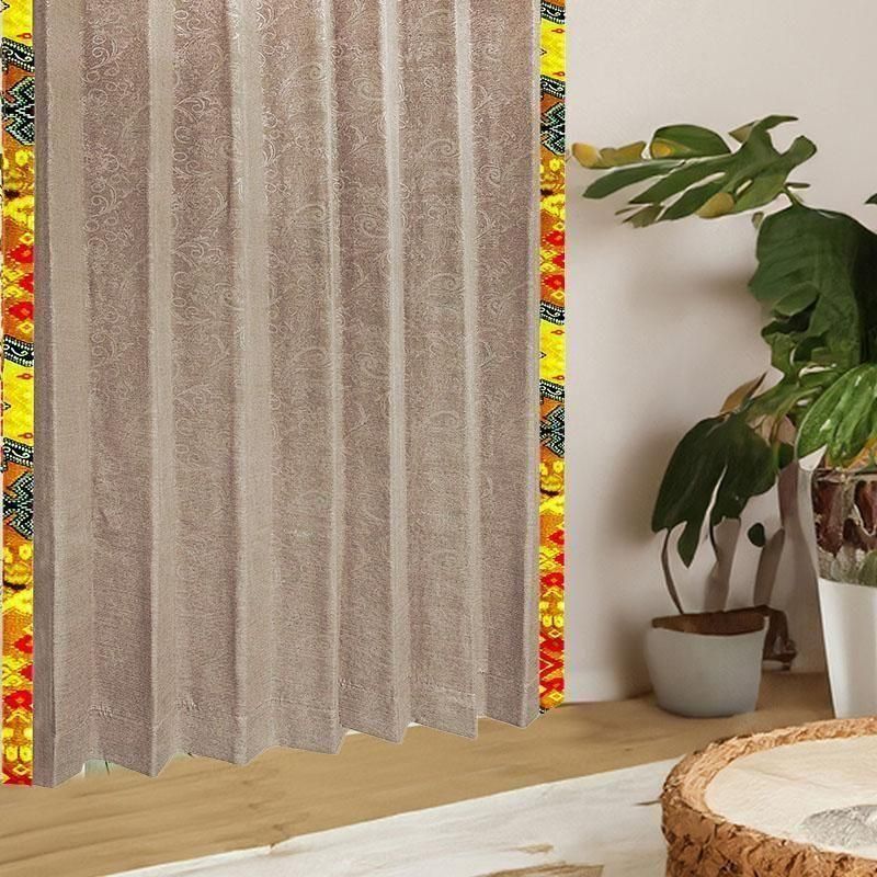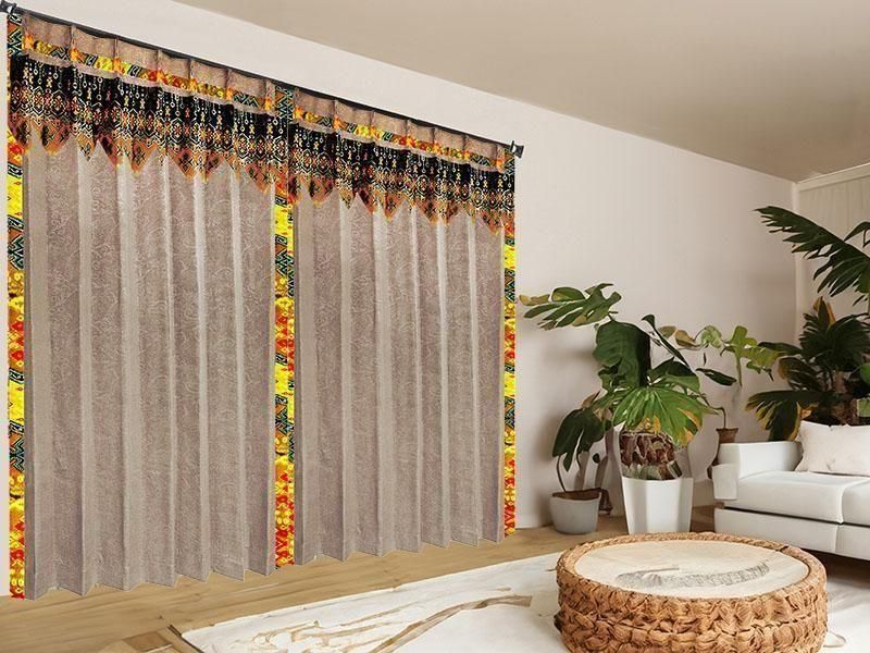 MEBRプルメリアMレスタリィは、ブラウンと黒の矢絣フリルが映えるモダンなメンズカーテン。