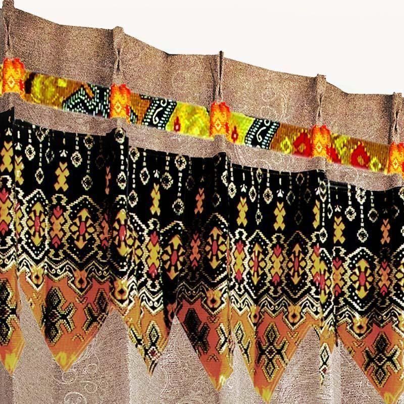 ブラウン色プルメリア柄ドレープ上部に、バリ島直輸入の黒の矢絣模様プラダバティック布フリルをあしらったモダンなオリジナルデザインです。