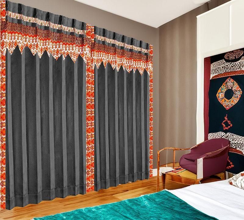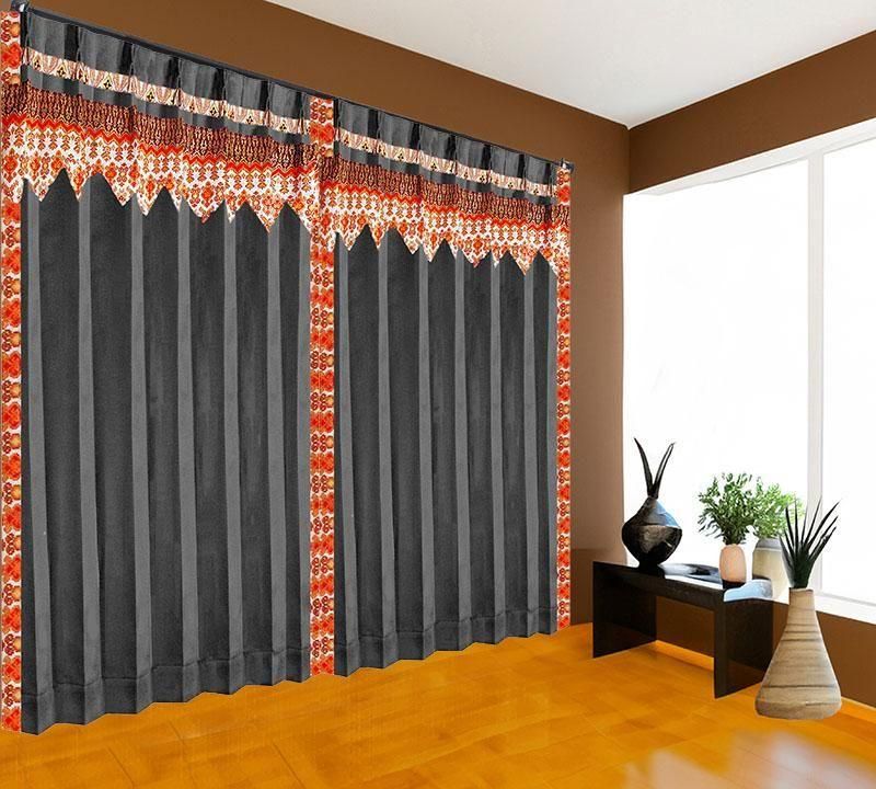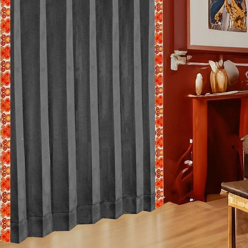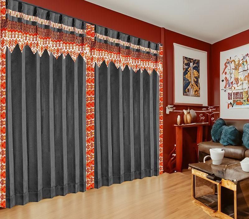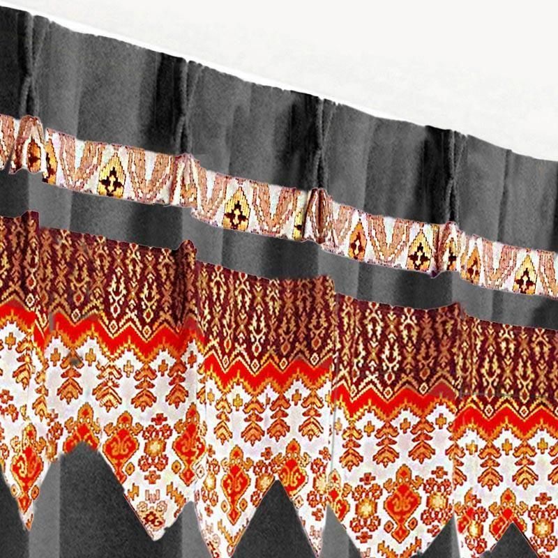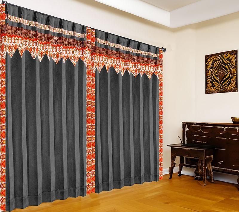 ブラックの無地ドレープ上部に、バリ島直輸入のマンダリンオレンジの立ち湧く模様プラダバティック布フリルを配したアジアン風オリジナルデザイン。遮光1級・防炎・遮熱・防音・保温を備え、ミニマルでかっこいい高級感ある男の部屋を演出するメンズカーテンです。