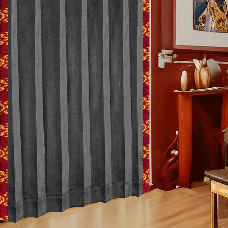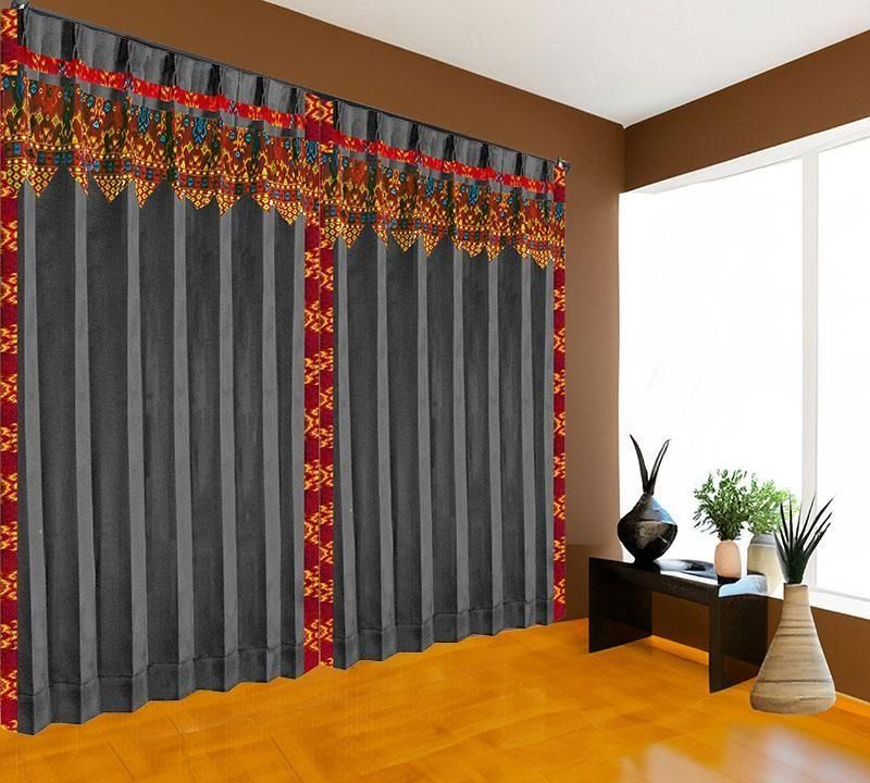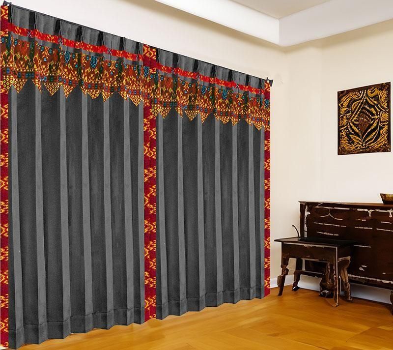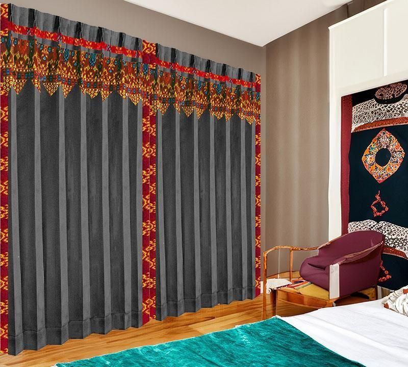 ブラックの無地ドレープ上部に、バリ島から直輸入したオレンジの生命の樹模様プラダバティック布フリルをあしらったアジアンモダンなオリジナルデザイン。遮光1級・防炎・遮熱・防音・保温の高機能を兼ね備え、ミニマルでかっこいい大人の男部屋を演出します。