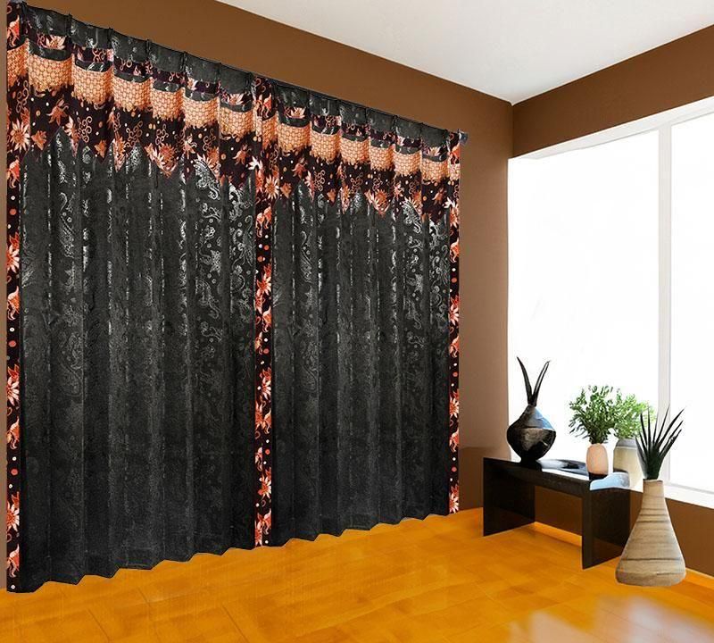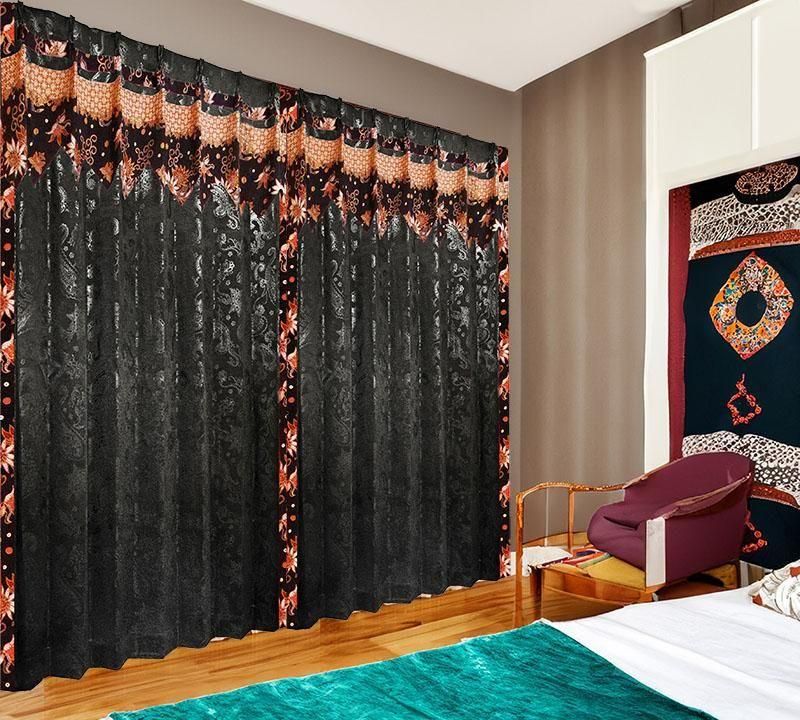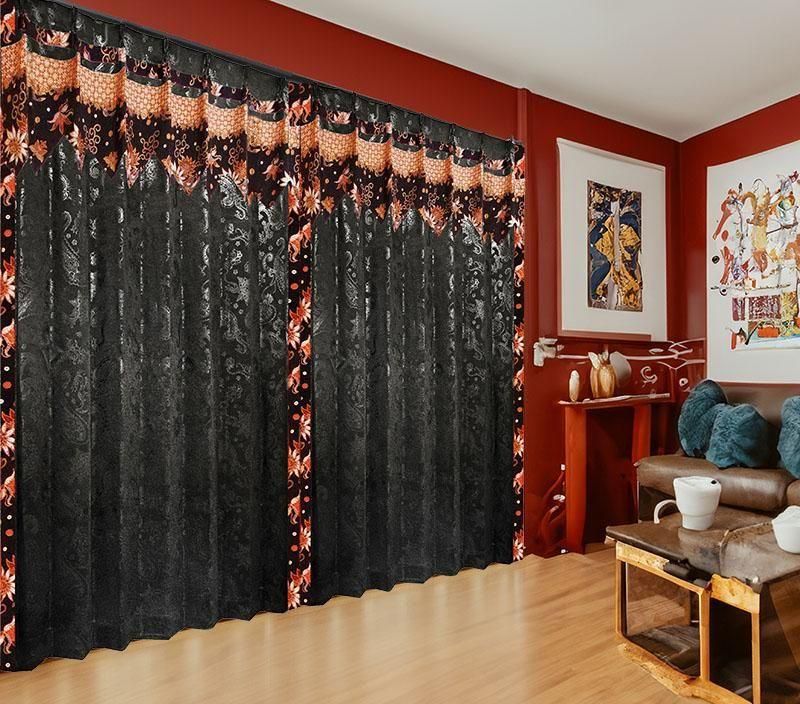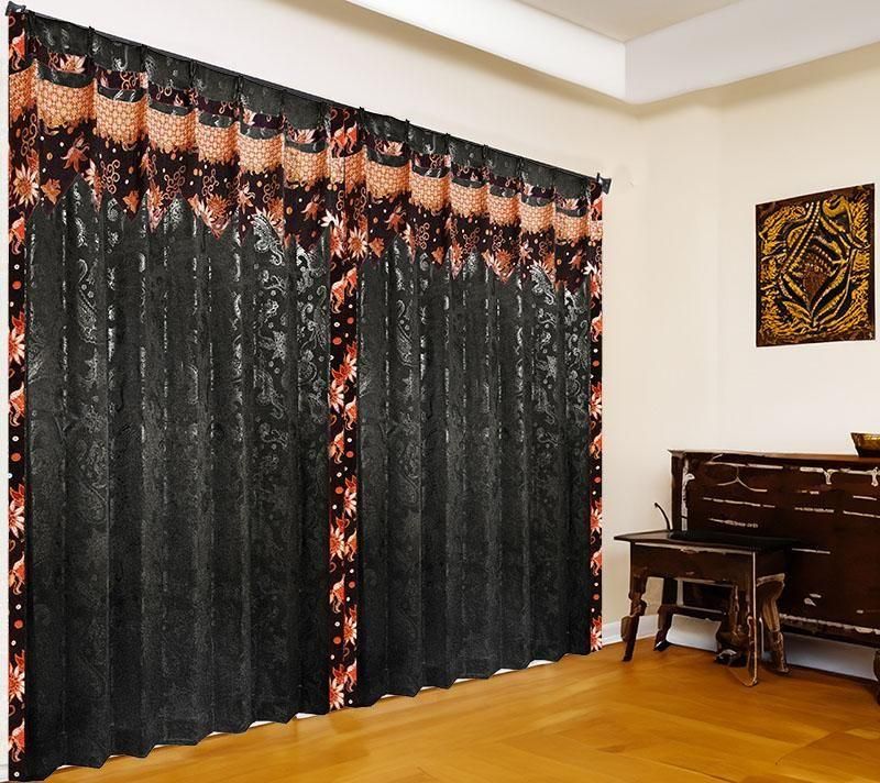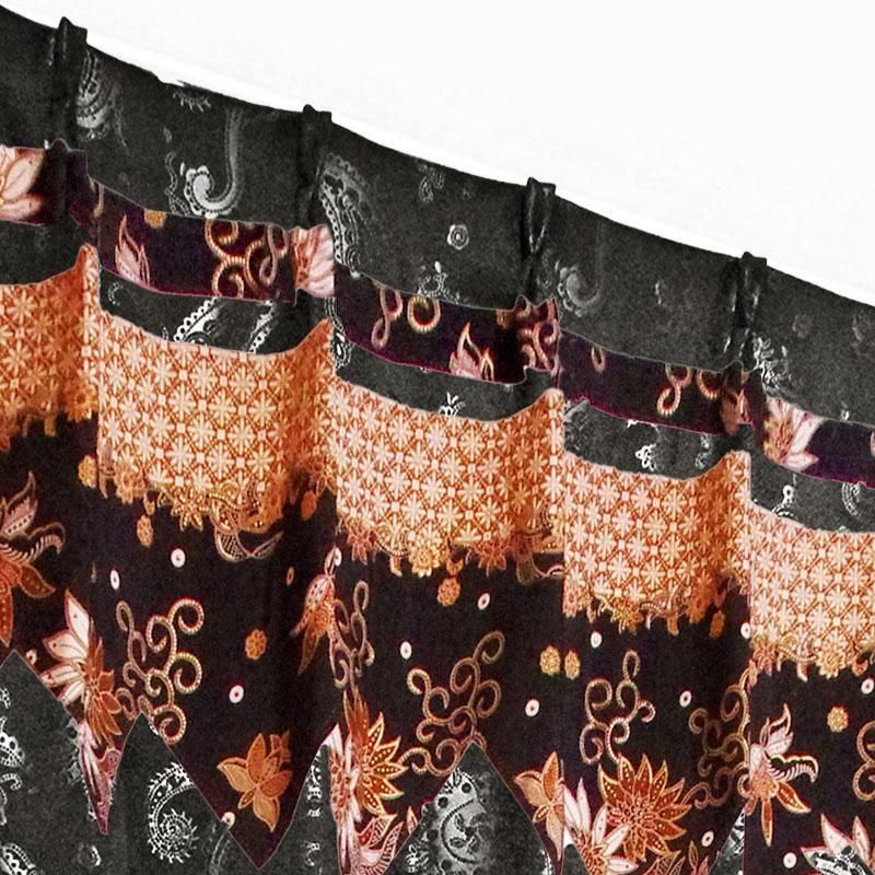 黒のペーズリー柄ドレープ上部に、バリ島直輸入のベージュの雪の輪模様プラダバティック布をフリルとして施したアジアンテイストのオリジナルメンズカーテン。遮光1級・遮熱・防音・保温の高機能で、かっこいいボヘミアン風の男部屋を上品かつクールに演出します。