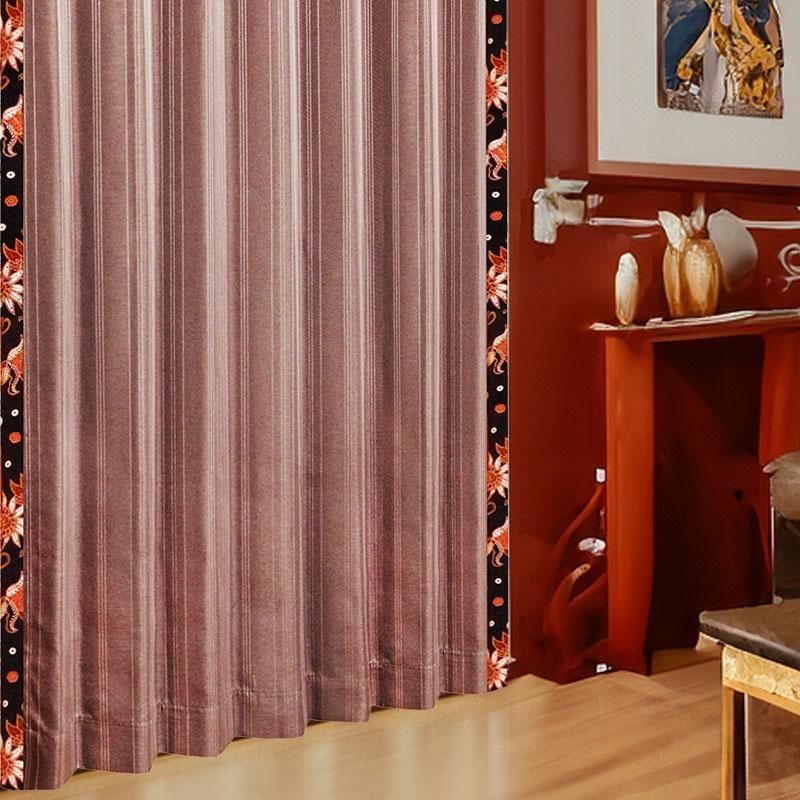 ブラウンのドレープが空間を引き締め、ピンストライプ柄が奥行きと落ち着きをプラス。ベージュ色雪の輪模様フリルが華やかさを添えつつ、重くなりすぎないモダンでミニマルな空間を作ります。間接照明と組み合わせれば、柄の陰影が浮かび上がり、落ち着きのあるアジアンテイストを楽しめます。
