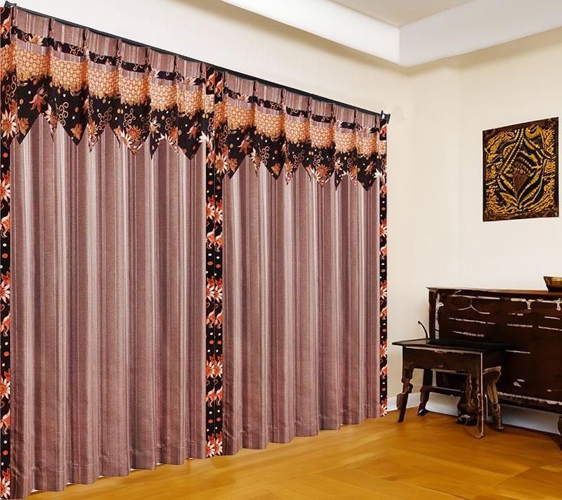 ブラウンのピンストライプ柄ドレープ上部に、バリ島直輸入のベージュ色雪の輪模様プラダバティック布をフリルとして施したオリジナルデザインのアジアンカーテン。遮光2級・形状記憶加工の高機能で、モダンでミニマルな部屋を上品かつ落ち着いた雰囲気に演出します。