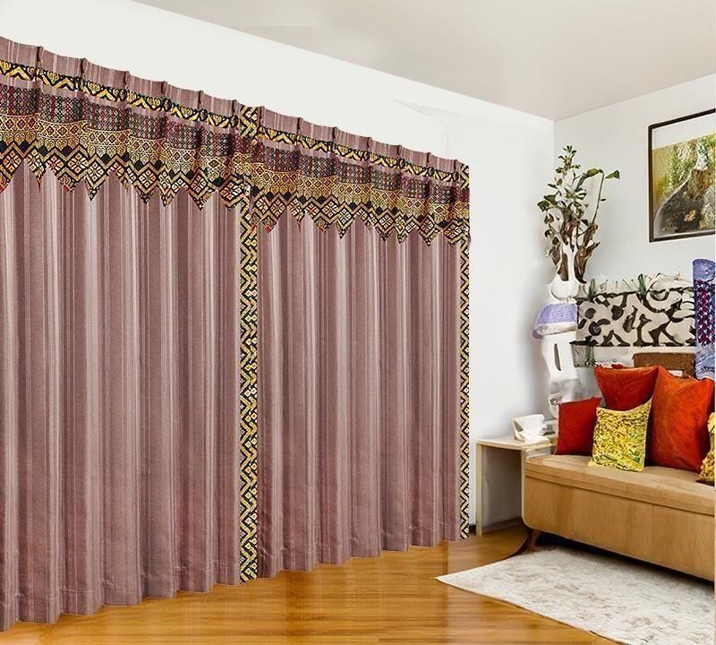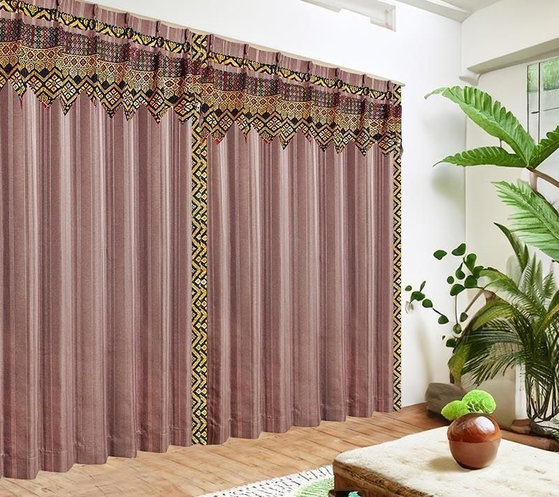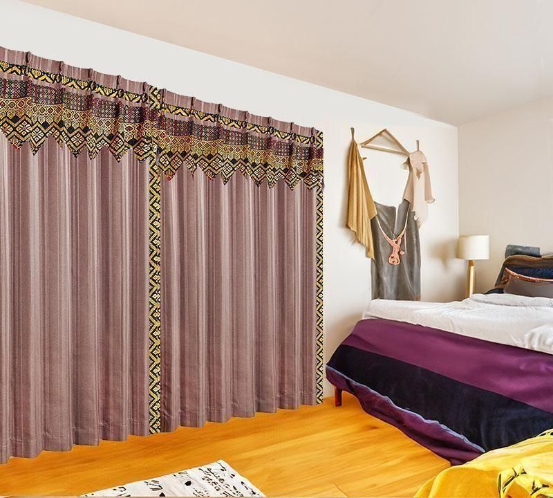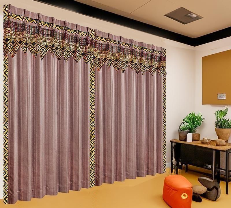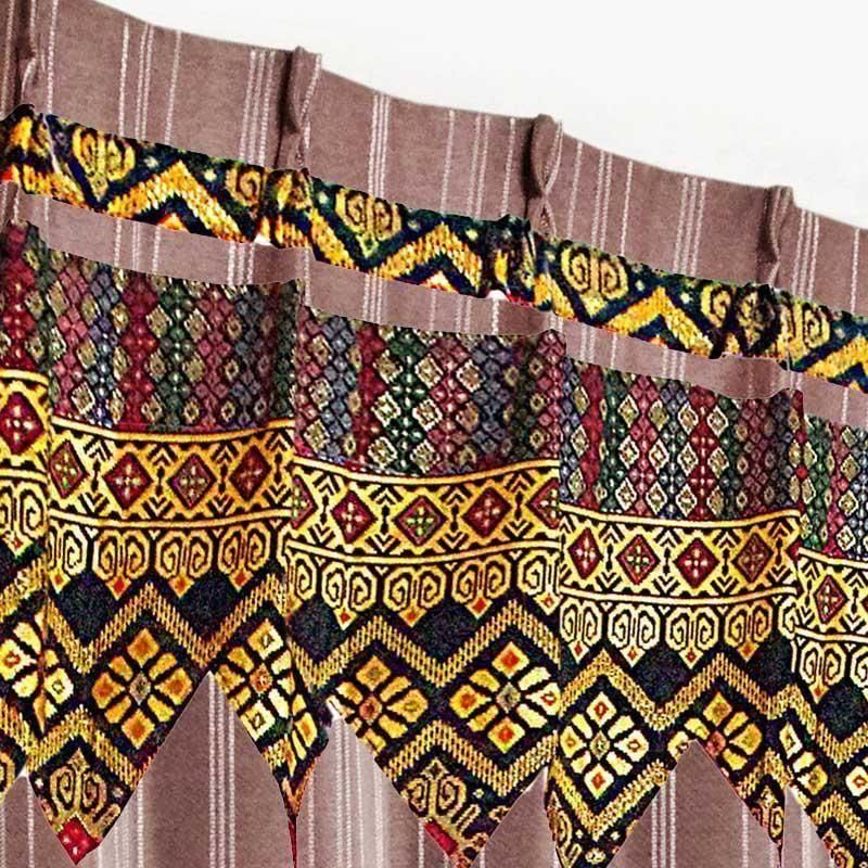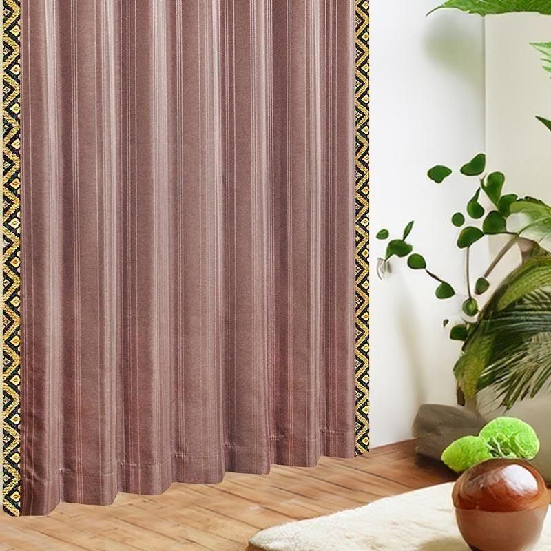 ブラウンのピンストライプ柄ドレープ上部に、バリ島直輸入のパープル菱模様プラダバティック布をフリルとして施したオリジナルデザインのメンズカーテン。遮光2級・形状記憶加工で、かっこいいミニマルな男前部屋を上品に演出します。