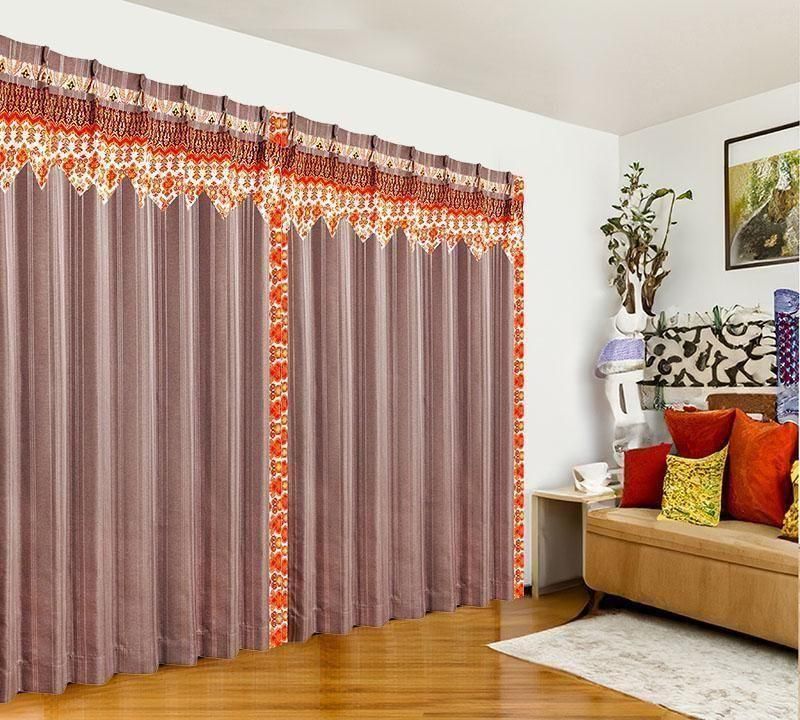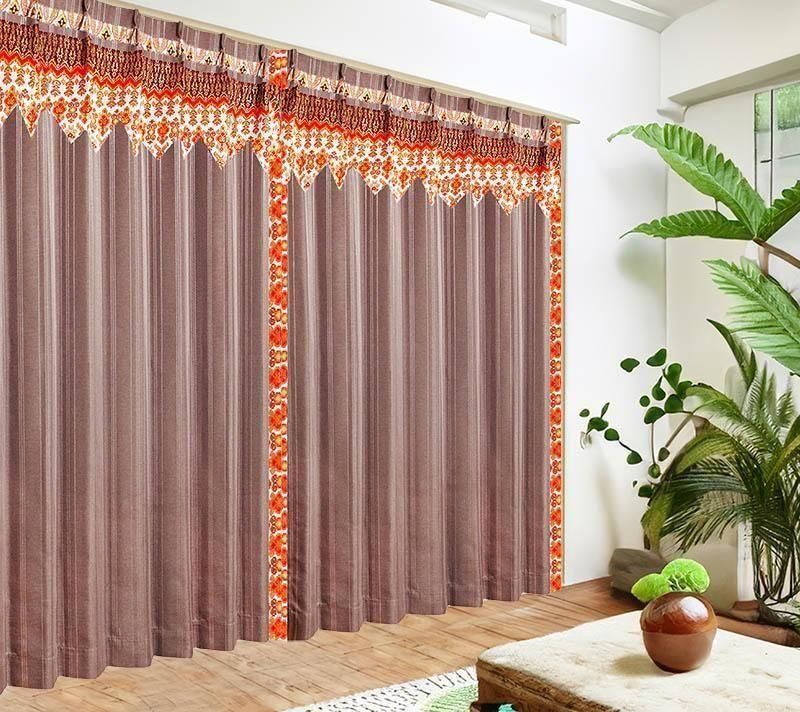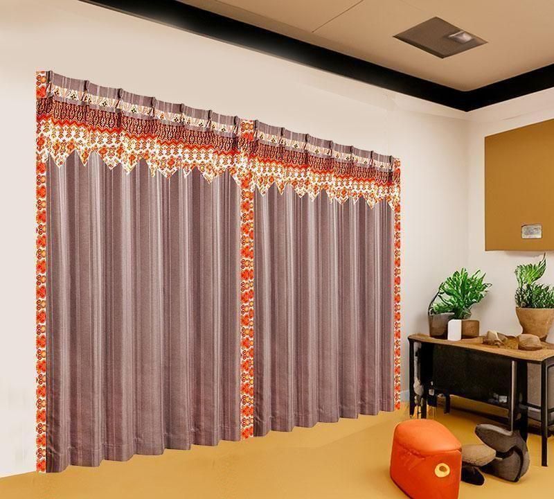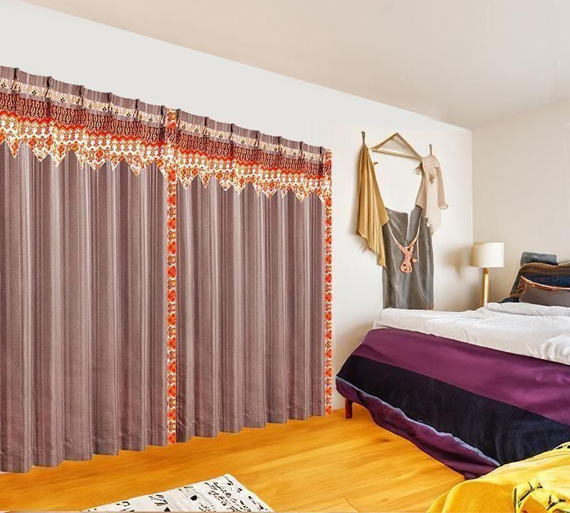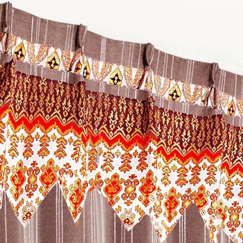 ブラウンのピンストライプ柄ドレープ上部に、バリ島直輸入のマンダリンオレンジ立ち湧く模様プラダバティック布をフリルとして施したオリジナルデザインのメンズカーテン。遮光2級・形状記憶加工で、かっこいいミニマルな男前部屋を上品に演出します。