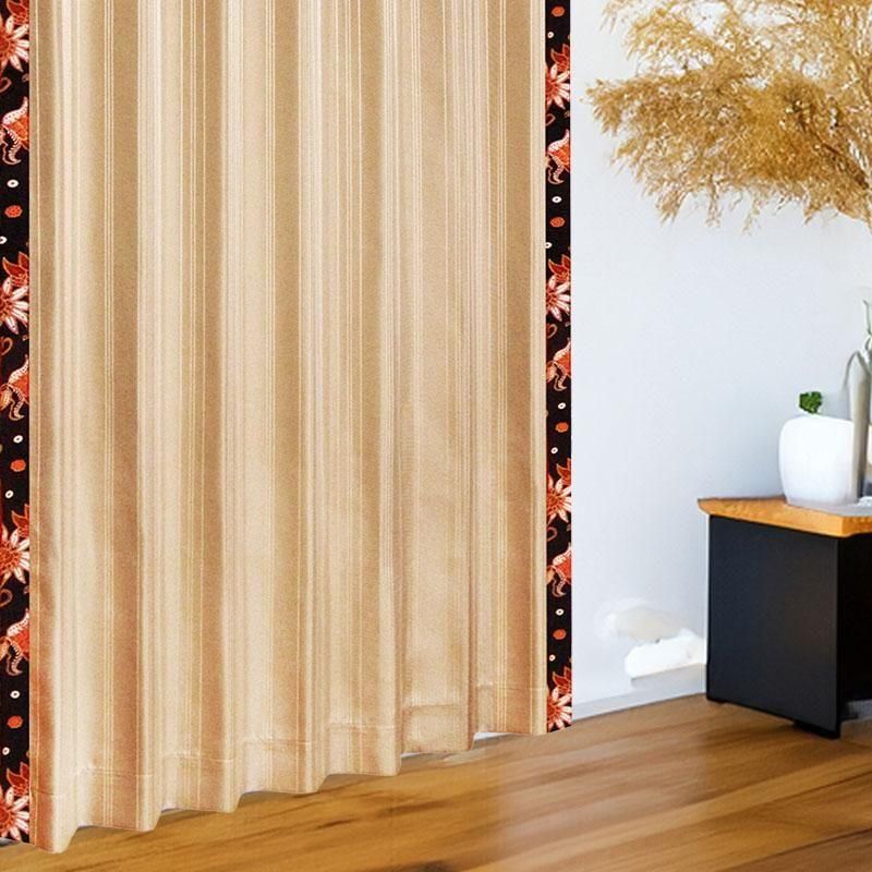 ベージュのピンストライプ柄ドレープに、赤色ハイビスカス模様のプラダバティック布をフリルとして組み合わせたメンズカーテン。遮光2級・形状記憶加工で、かっこいいラグジュアリーな男部屋を華やかに彩ります。