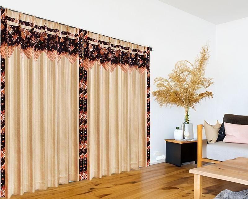 ベージュピンストライプ柄ドレープ上部に、バリ島直輸入の赤色ハイビスカス模様プラダバティック布をフリルとして施したオリジナルデザイン。遮光2級・形状記憶加工で美しいドレープを長く保ち、モダンで落ち着きと華やかさを兼ね備えたアジアン空間を演出します。