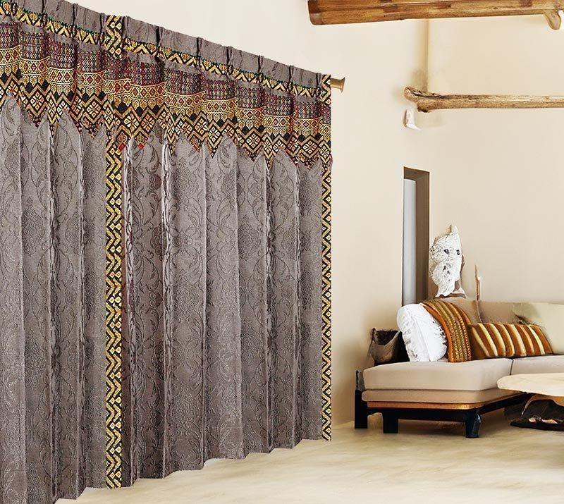 ブラウン色ロココ調ダマスク柄ドレープ上部に、バリ島直輸入のパープルダイヤ模様プラダバティック布をフリルとして組み合わせたメンズカーテン。遮光1級で重厚感とかっこよさを兼ね備え、男の部屋を上質に演出します。