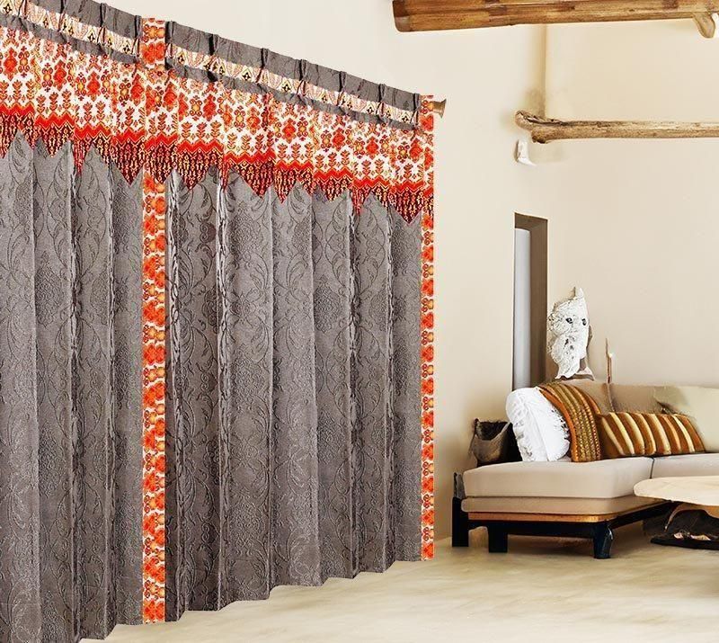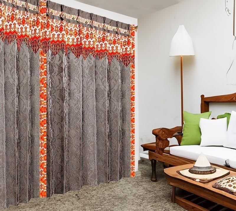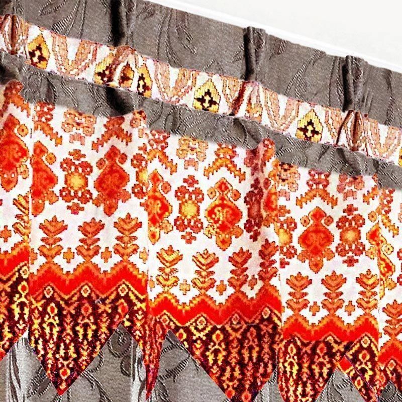 ブラウン色ロココ調ダマスク柄ドレープ上部に、バリ島直輸入のオレンジ宝尽くし模様プラダバティック布をフリルとして組み合わせたメンズカーテン。遮光1級で重厚感とかっこよさを兼ね備え、男の部屋を上質に演出します。