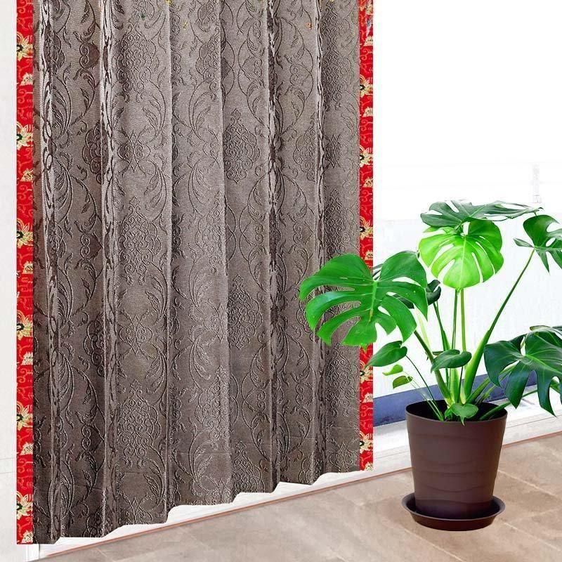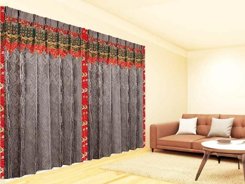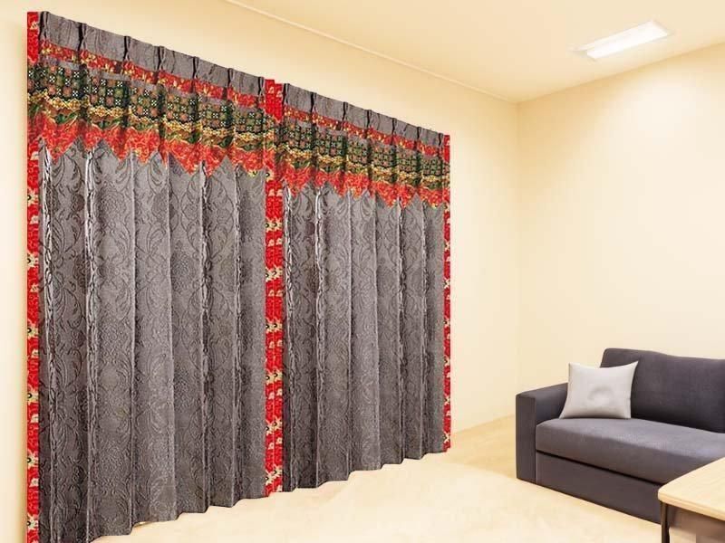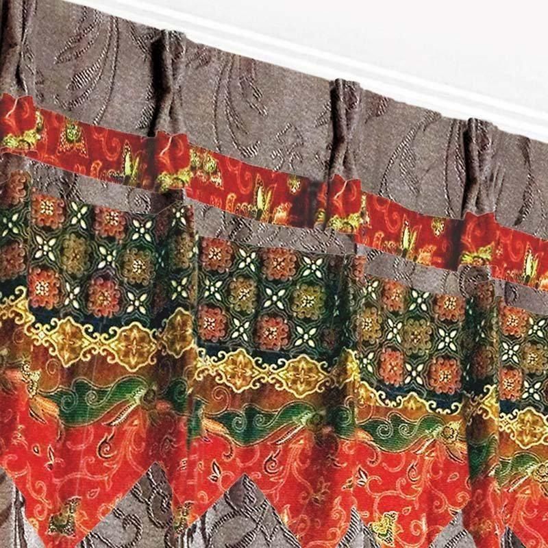 ブラウン色ロココ調ダマスク柄ドレープ上部に、バリ島直輸入のブラウン小桜チェック模様プラダバティック布をフリルとして組み合わせたメンズカーテン。遮光1級で重厚感とかっこよさを兼ね備え、男の部屋を上質に演出します。
