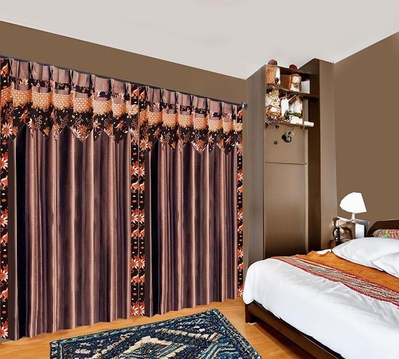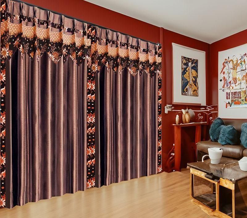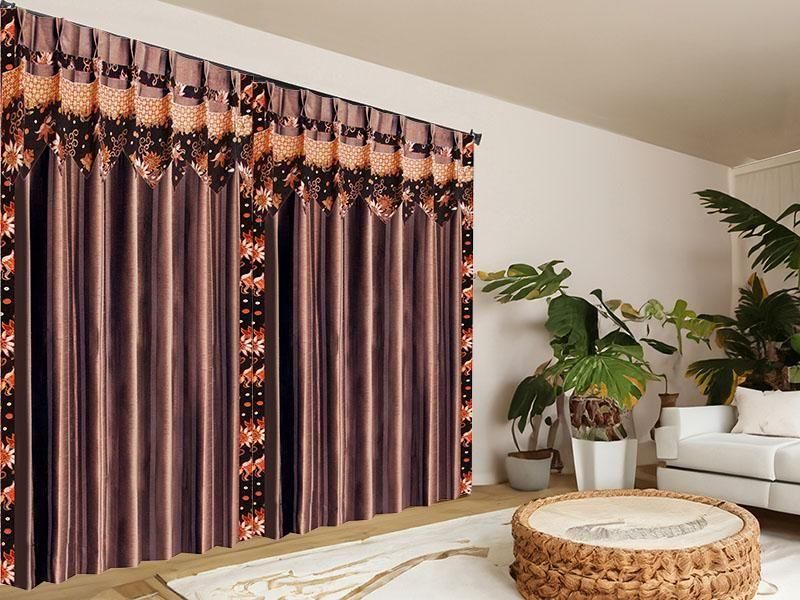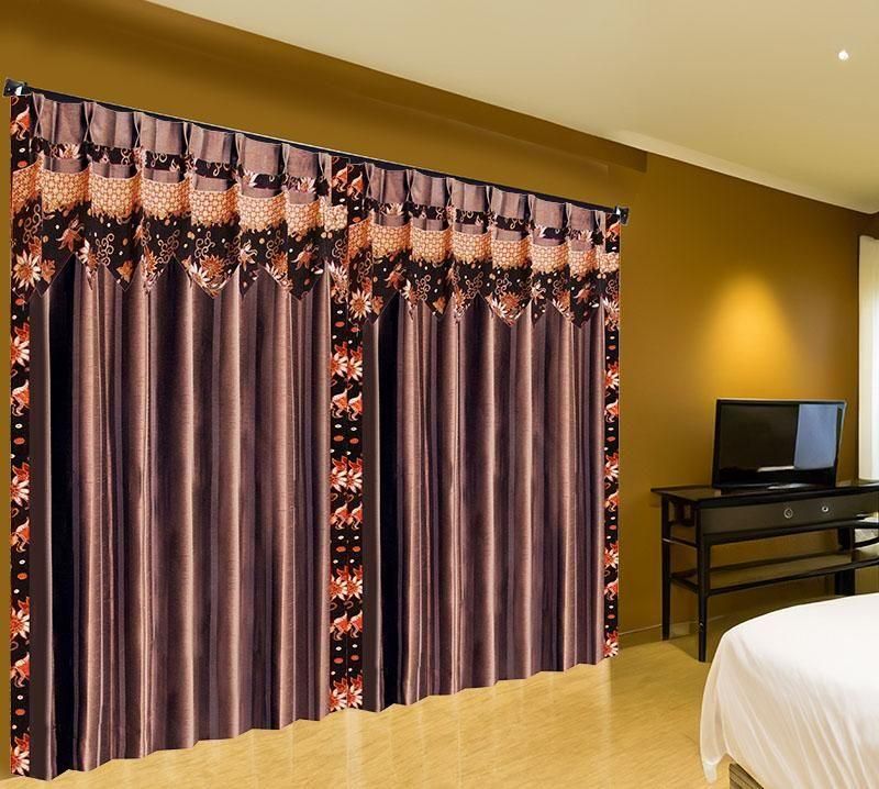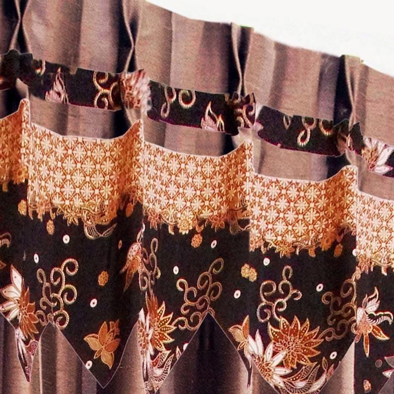 ブラウンのストライプ柄ドレープ上部に、バリ島直輸入のベージュ小桜チェック模様プラダバティック布をフリルとしてあしらった、アーバンモダンなアジアンカーテン。遮光1級で上質かつ落ち着いた都会的空間を演出します。