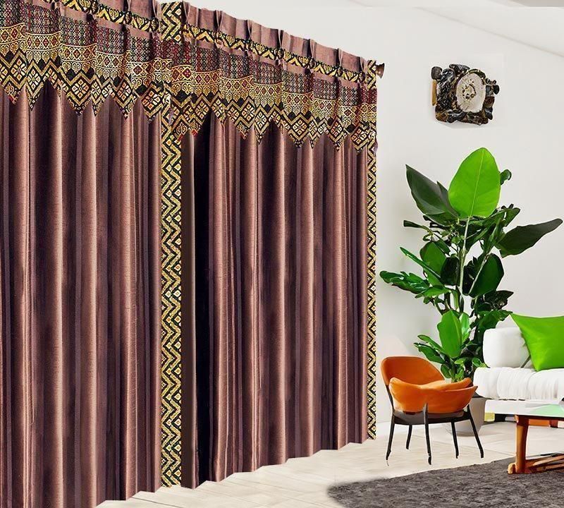 ブラウンのストライプ柄ドレープに、バリ島直輸入パープルのダイヤ模様プラダバティック布をフリルとして組み合わせた、アーバンライクなメンズカーテン。遮光1級で大人のかっこよさと重厚感を演出します。