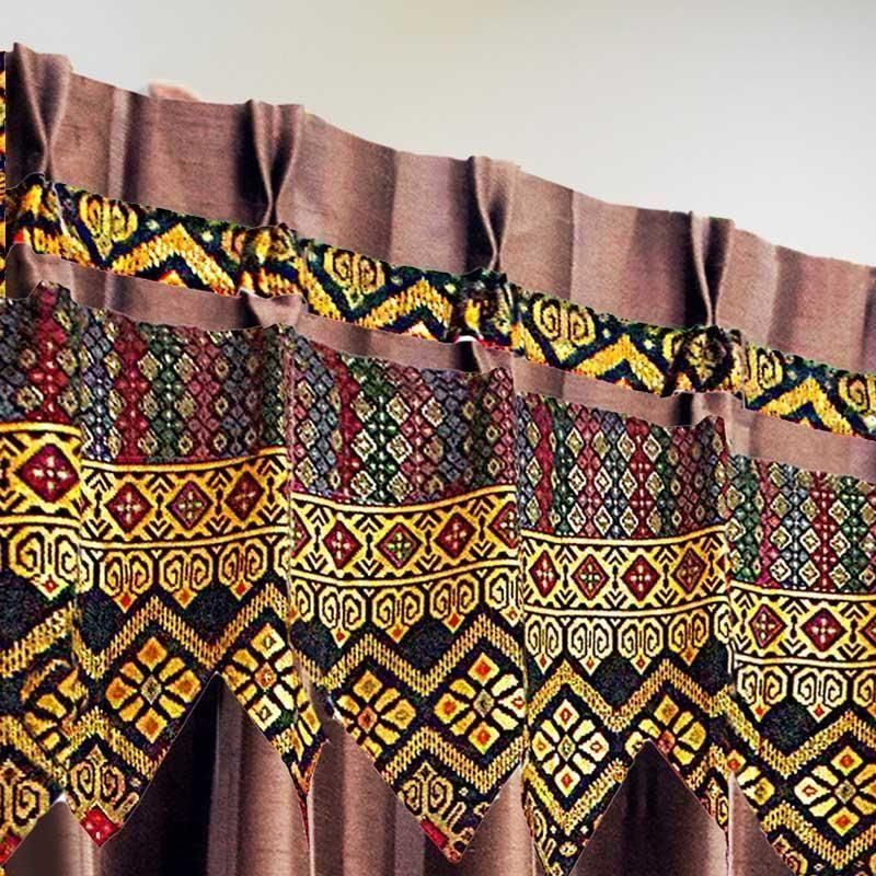 「MEBRラインMトレジャー」は、ブラウンストライプ柄ドレープ上部に、バリ島直輸入のパープルのダイヤ模様プラダバティック布をフリルとして施した、アーバンライクなアジアン風デザインのメンズカーテンです。遮光1級の高機能性と深みのある配色が、かっこいい大人の部屋を引き立てるオリジナルモデルです。