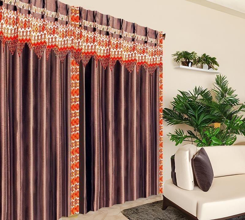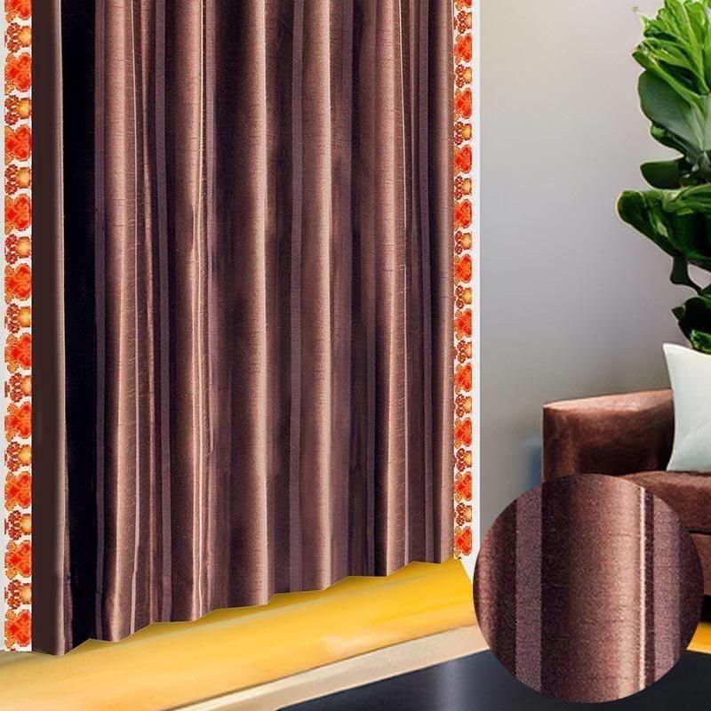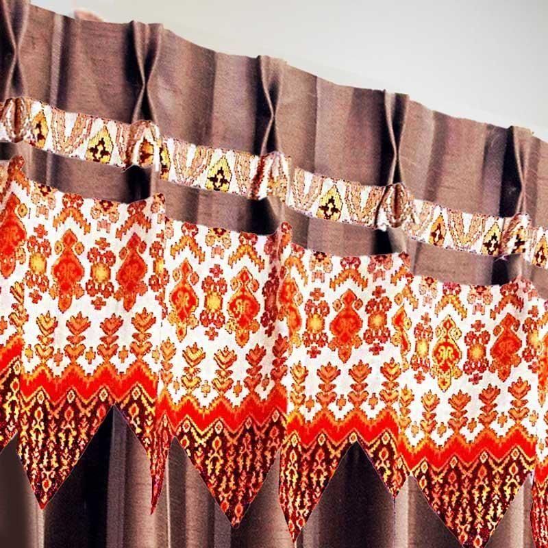 ブラウンのストライプ柄ドレープに、バリ島直輸入オレンジの宝尽くし模様プラダバティック布をフリルとして組み合わせた、アーバンライクでかっこいいメンズ向け遮光1級カーテン。都会的で深みのある男部屋を演出します。