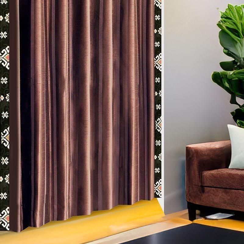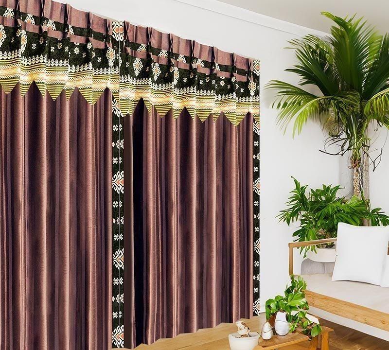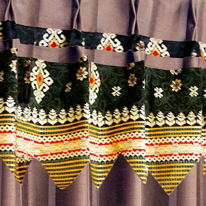 「MEBRラインMプーケット」は、ブラウン色ストライプ柄ドレープ上部に、バリ島直輸入の黒の紋章模様プラダバティック布をフリルとして贅沢にあしらった、アーバンライクなアジアン風メンズカーテンです。遮光1級の高機能と重厚感あるデザインで、かっこいい男部屋を演出します。