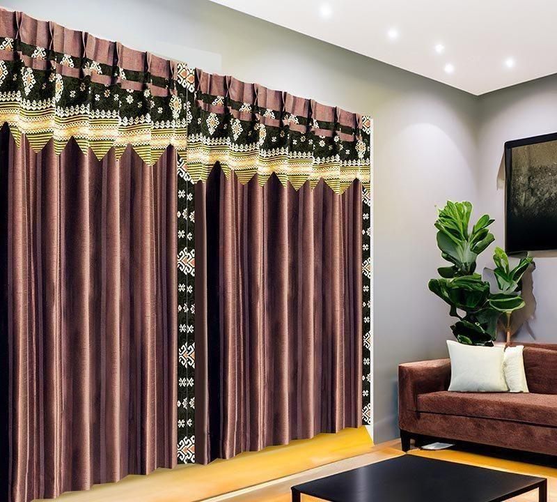 ブラウンストライプ柄ドレープに、バリ島直輸入の黒の紋章模様プラダバティック布をフリルとして組み合わせた、アーバンライクでかっこいいメンズ向け遮光1級カーテン。都会的で重厚感のある男部屋を演出します。
