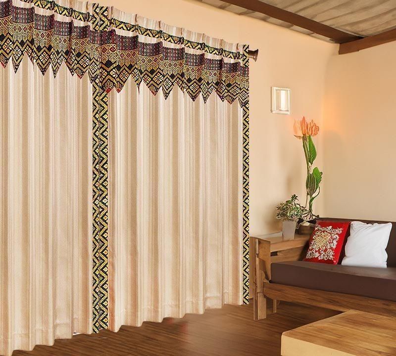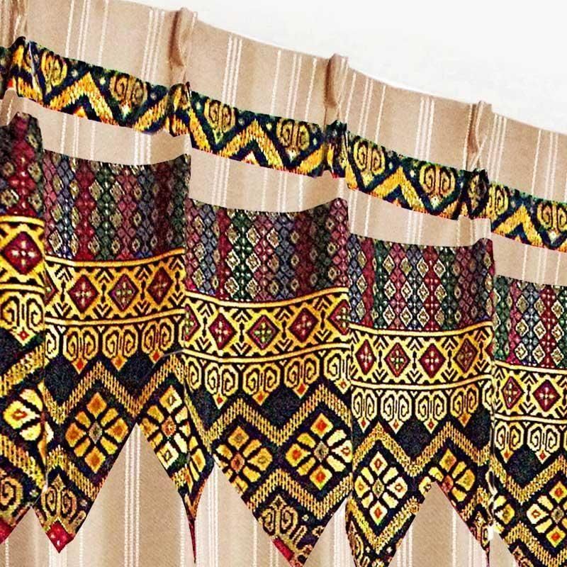 MEBEジオンMトレジャーは、上質なベージュ色ピンストライプ柄ドレープ上部に、バリ島から直輸入したパープルのダイヤ模様プラダバティック布をフリルとして施した、ラグジュアリーなアジアン風メンズカーテンです。遮光2級と形状記憶加工により、美しいシルエットと快適な室内環境を両立します。