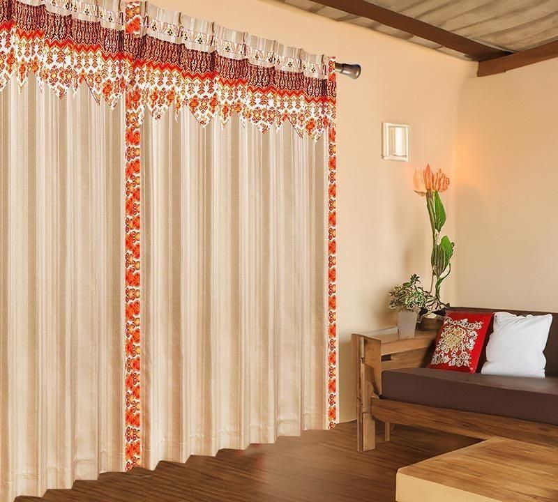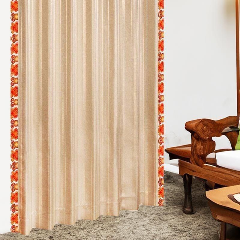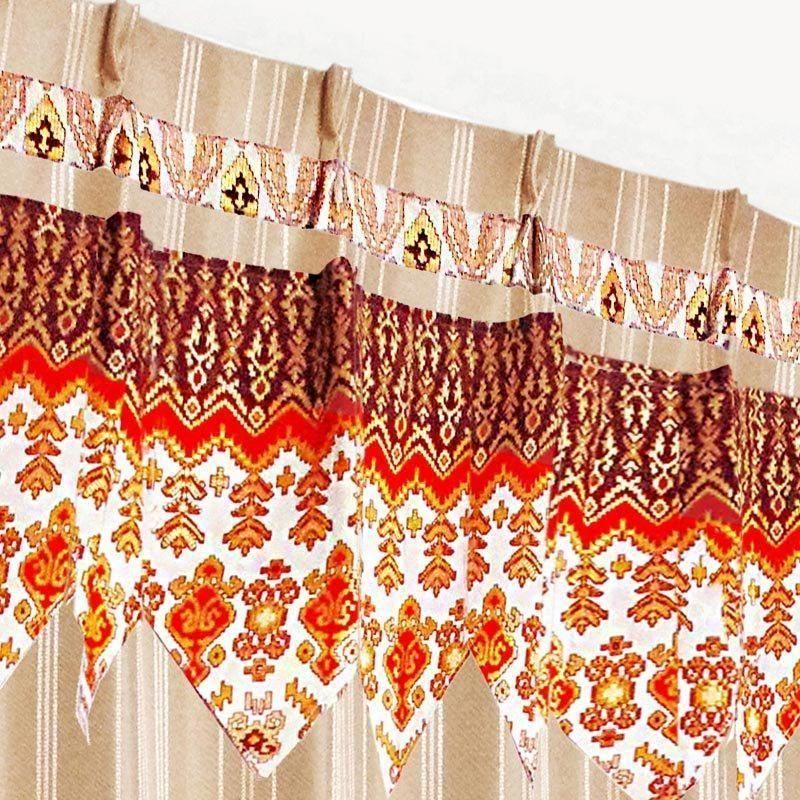 ベージュのピンストライプドレープに、バリ島直輸入マンダリンオレンジの立ち湧く模様プラダバティック布をフリルとして合わせた、ラグジュアリーでかっこいいメンズ向け遮光2級カーテン。上質な男部屋を演出します。