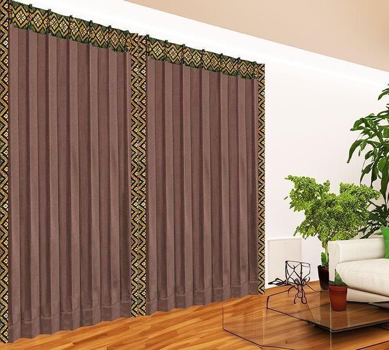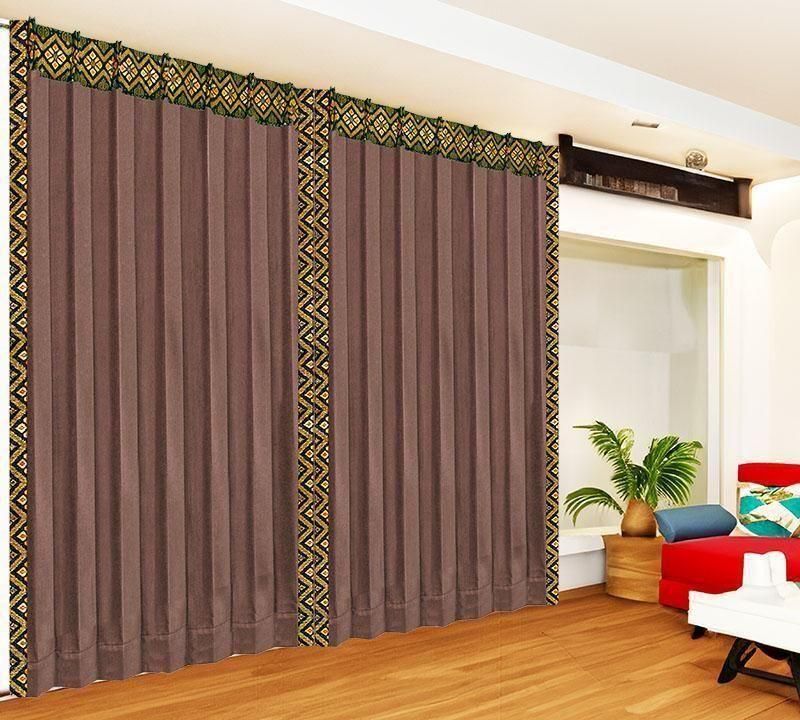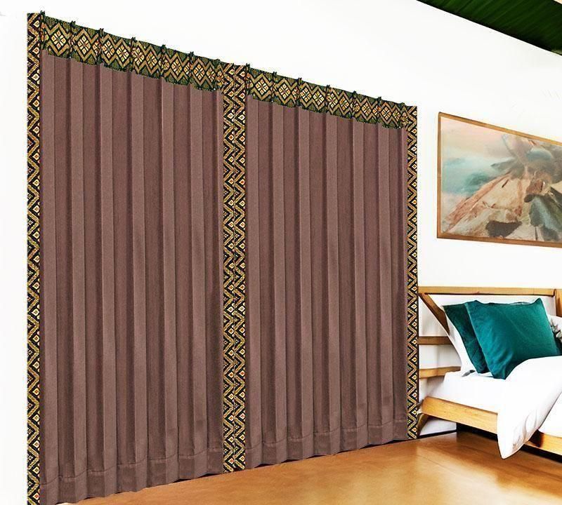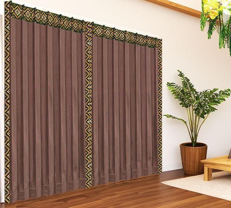 深みのあるブラウン無地ドレープに、バリ島直輸入イエローのプルメリア模様プラダバティック布をフレーム状にあしらった、遮光1級のメンズカーテン。シックな男部屋に、明るさと品格を添えます。