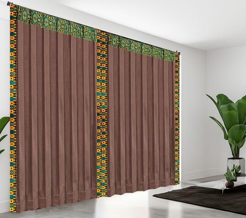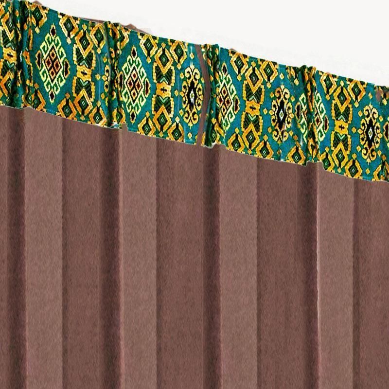 深みのあるブラウン無地ドレープに、バリ島直輸入ターコイスブルーの曼陀羅模様プラダバティック布をフレーム状にあしらった、遮光1級のメンズカーテン。シックでおしゃれな男部屋を演出します。