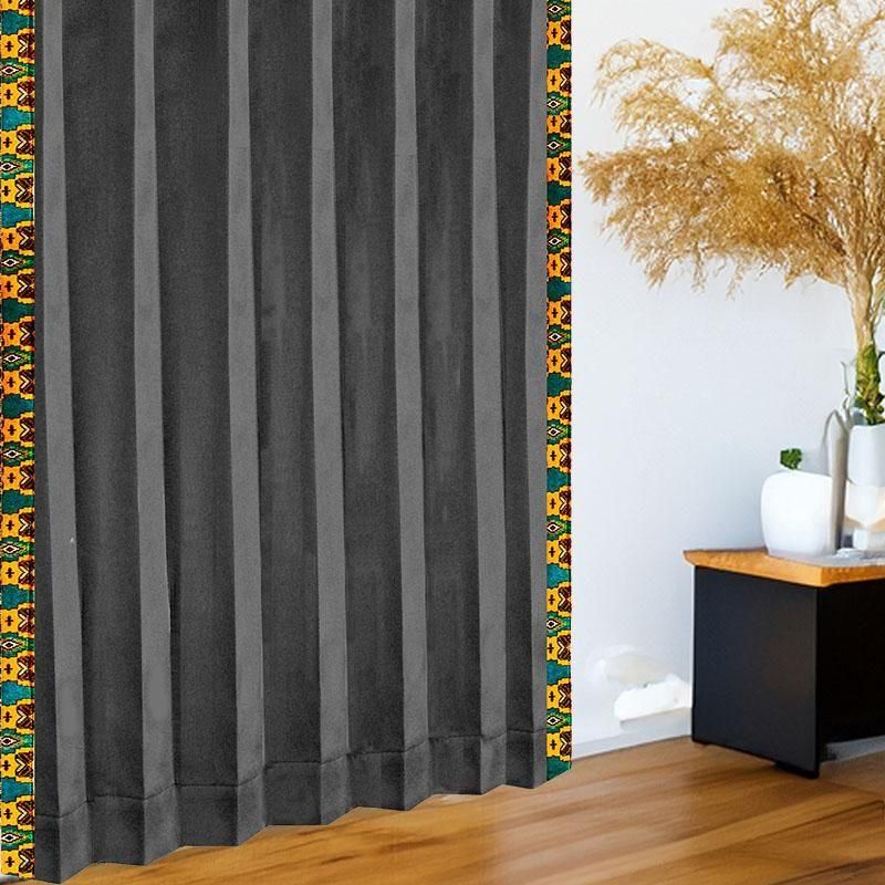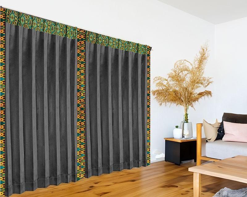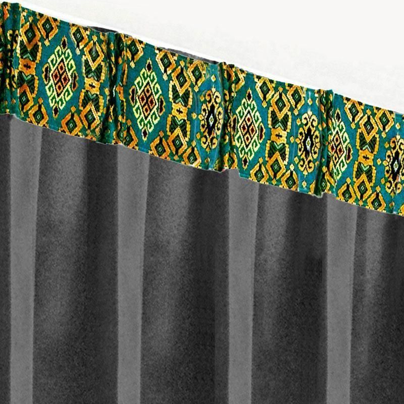 重厚感のあるブラック無地ドレープに、バリ島直輸入ターコイスブルーの曼陀羅模様プラダバティック布をフレーム状にあしらった、遮光1級のアジアンリゾートカーテン。都会的で洗練されたリゾート空間を演出します。