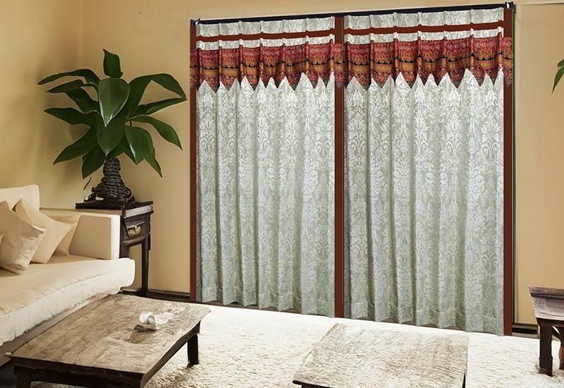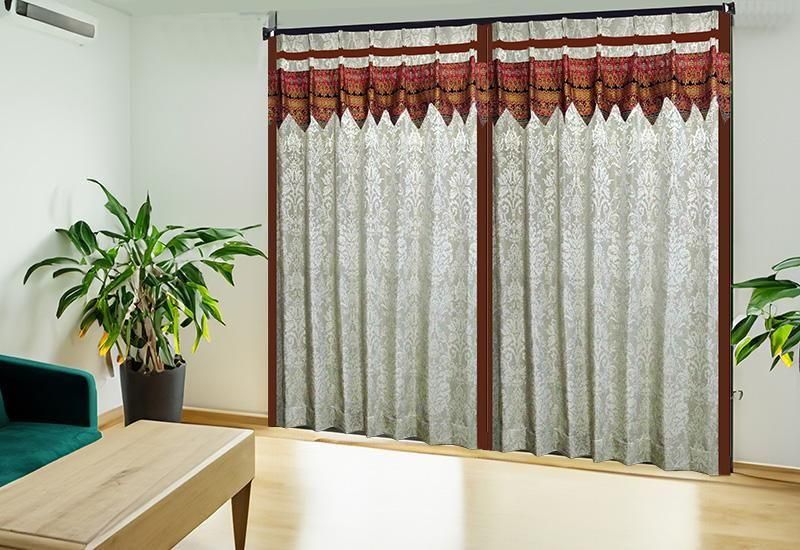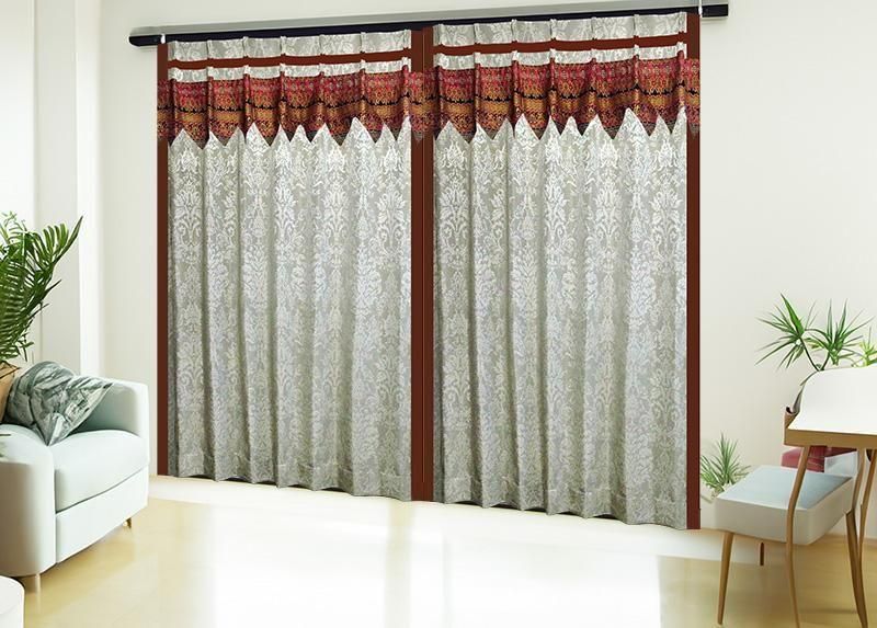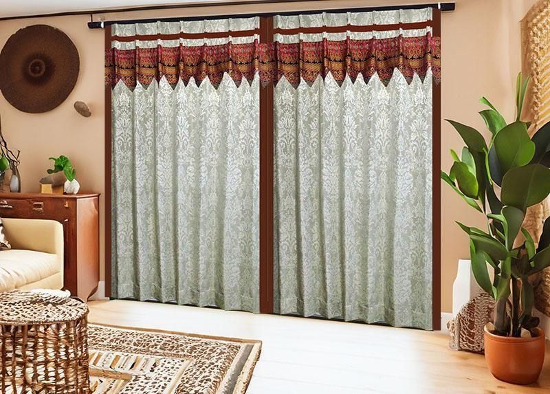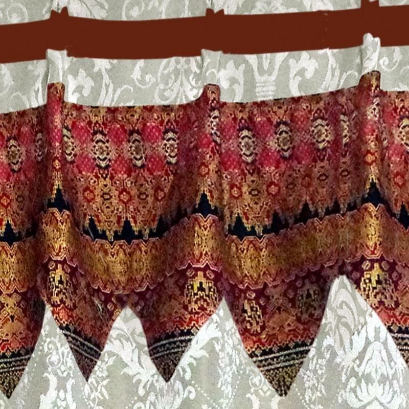 高級感あるブラウンのジャカード織りダマスク柄ドレープに、バリ島直輸入の赤〜ブラウン〜金系セメン文様バティック布フリルを施した、裏地付き遮熱防音アジアンカーテン。重厚で洗練されたモダンアジアン空間を演出します。